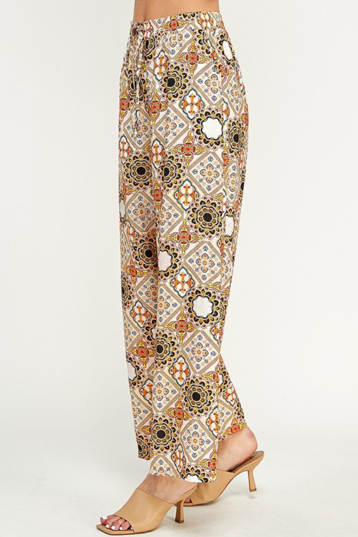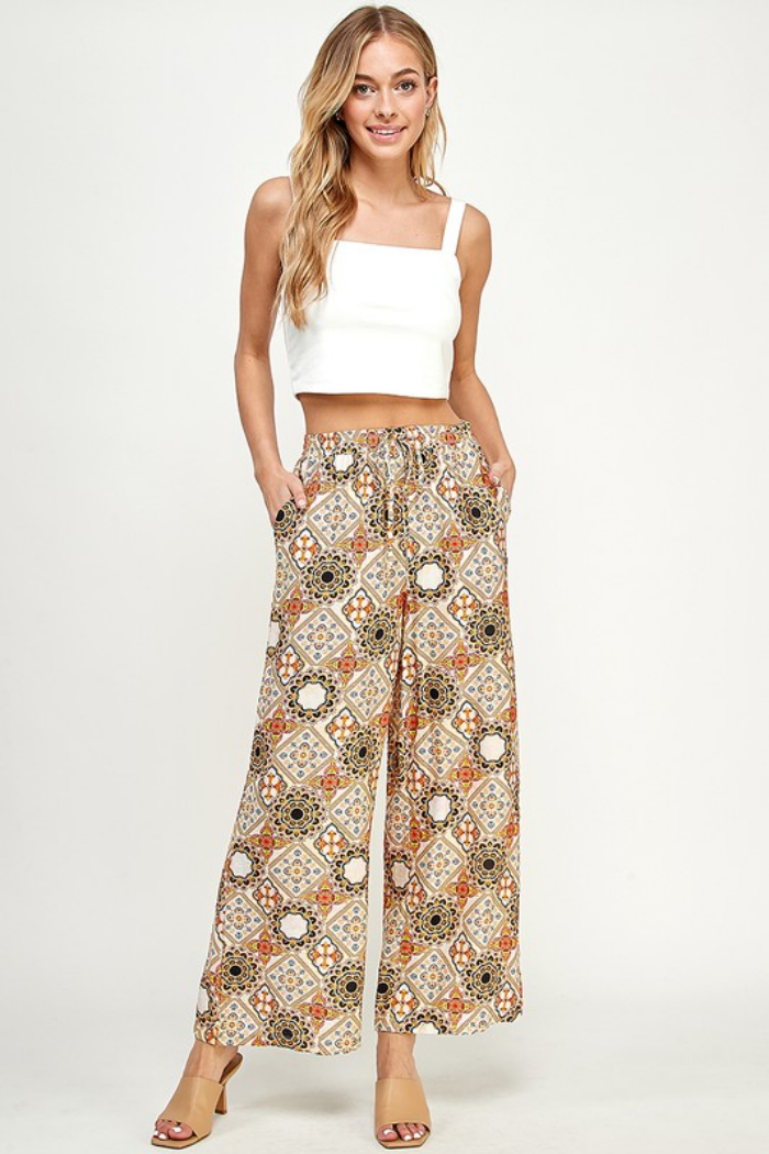 We love these bohemian inspired wide leg pants. Pair with a solid fitted top and wedge heels.