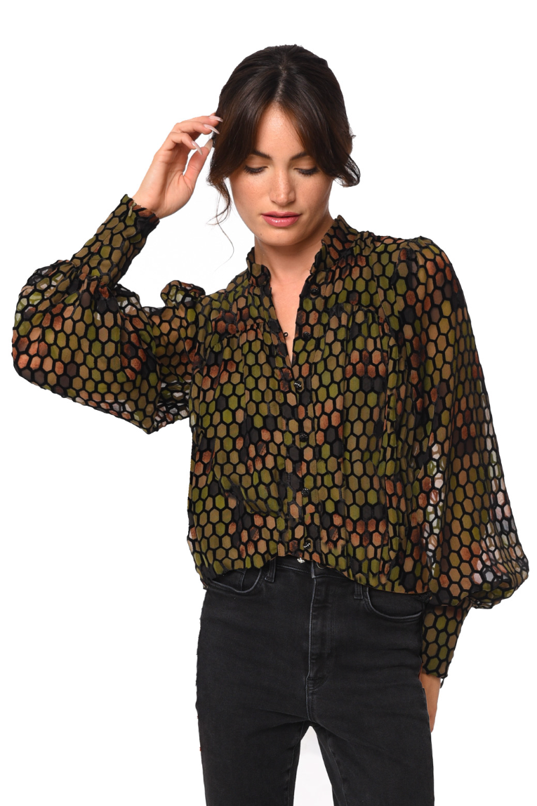 The details on this button front blouse are endless. Mock neck, puff sleeves, and a zipper fitted cuff are the highlights. Elastic waist and colors ready for colder weather. Pair with jeans or black pants.