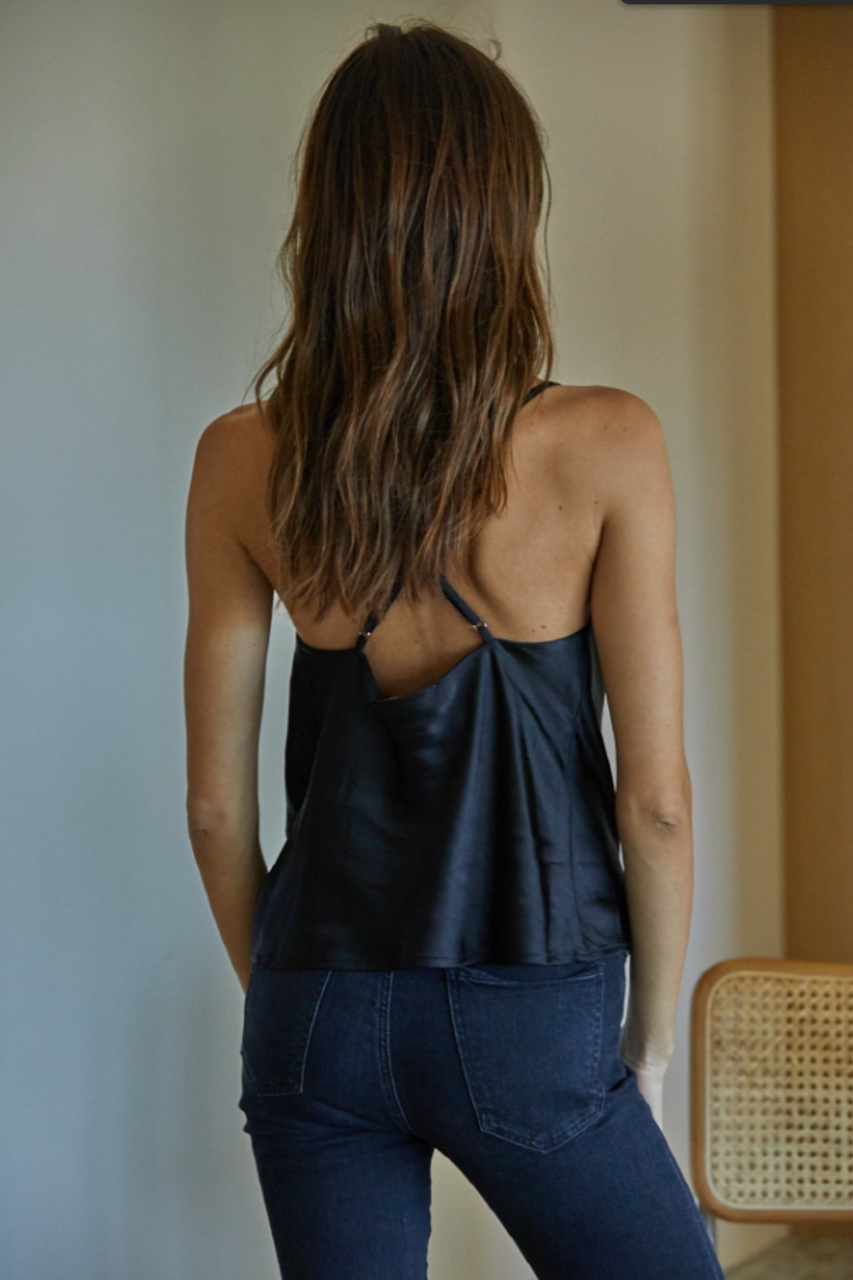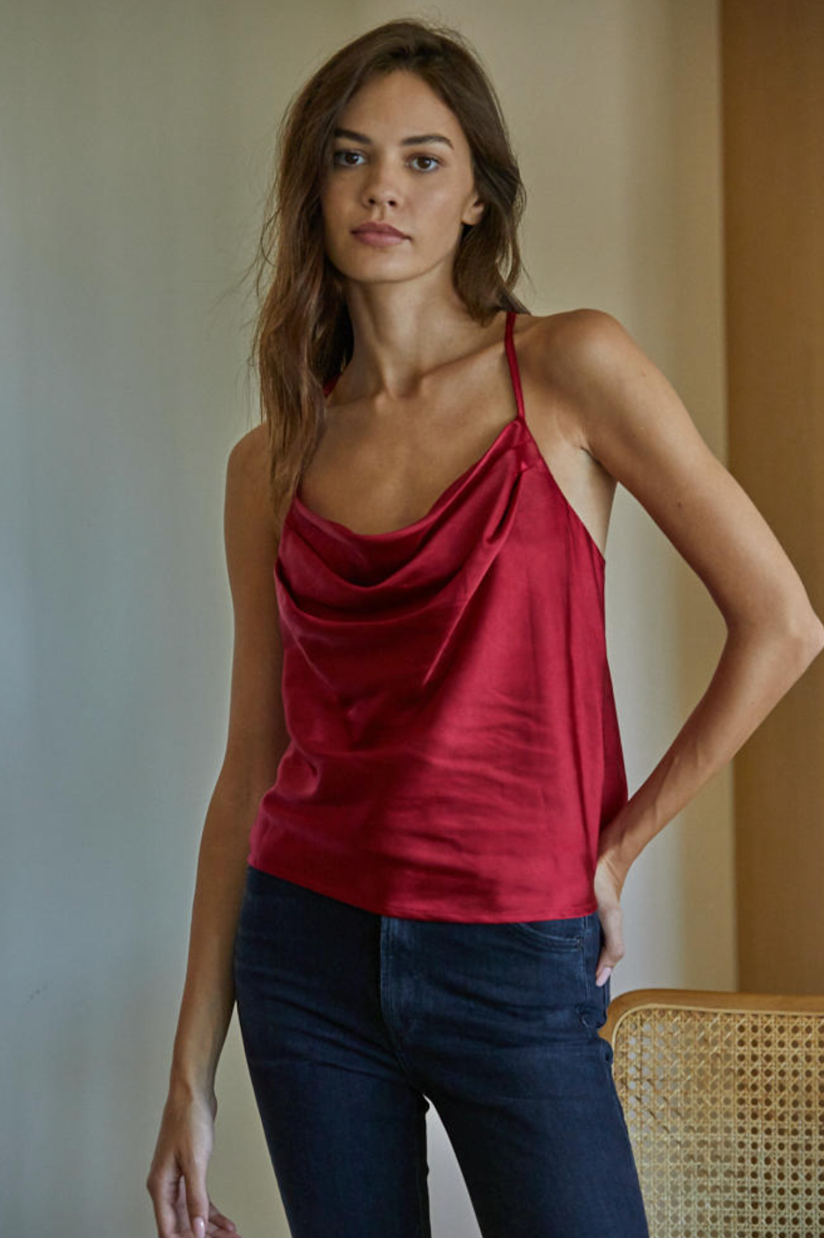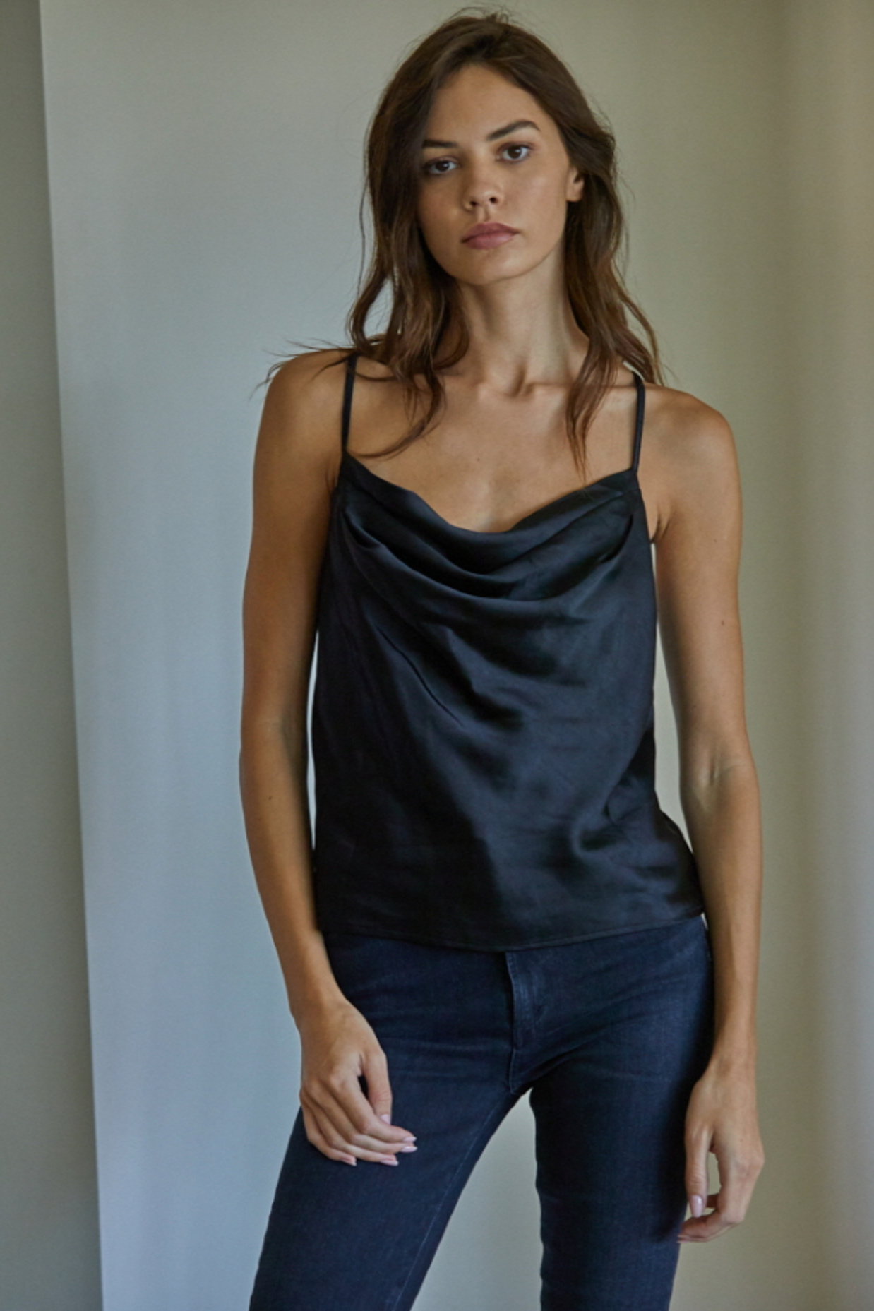 This satin cowl neck blouse has criss cross straps. Easy to pair with jeans or dress up with a skirt.