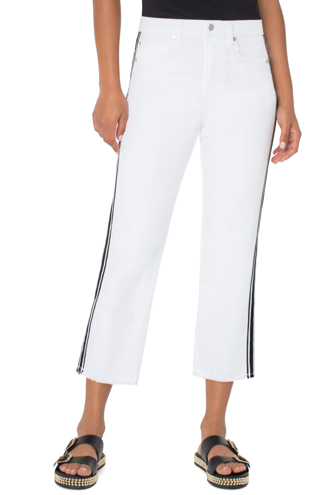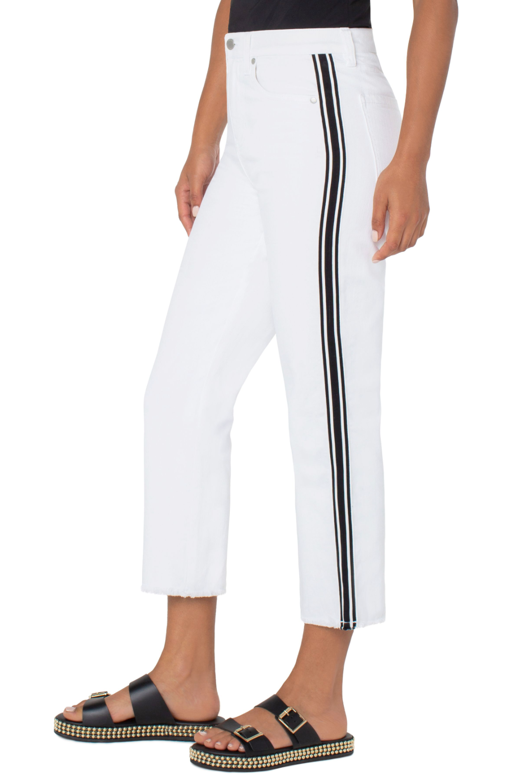These straight white pants are great for summer. They have a black sport stripe down the side. Looks great with black shoes.