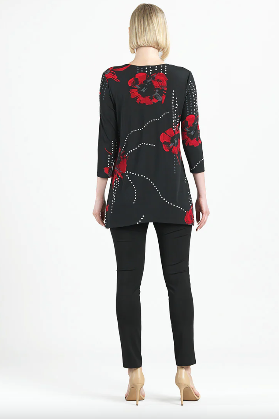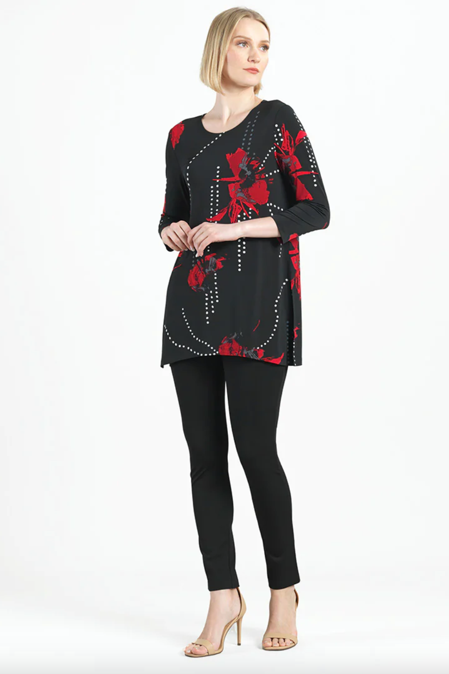 Connect the fashion dots and allow your wardrobe to blossom in our Polka Poppy Side Vent Kerchief Hem Tunic! This tunic features a round neckline, 3/4 length sleeves, and a kerchief hemline with dual side vents that create a flattering silhouette.