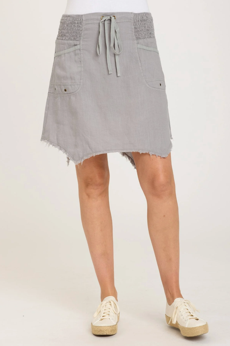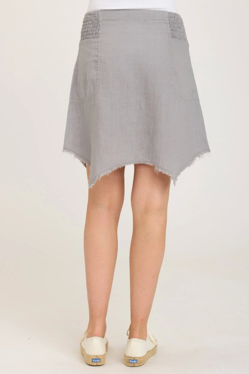 An asymmetrical sharkbite hem makes this knee-grazing skirt stand out. Featuring antique brass grommet-adorned pockets and adjustable drawstring smocked waist, Kimball is one-of-a-kind in breezy Light Linen.