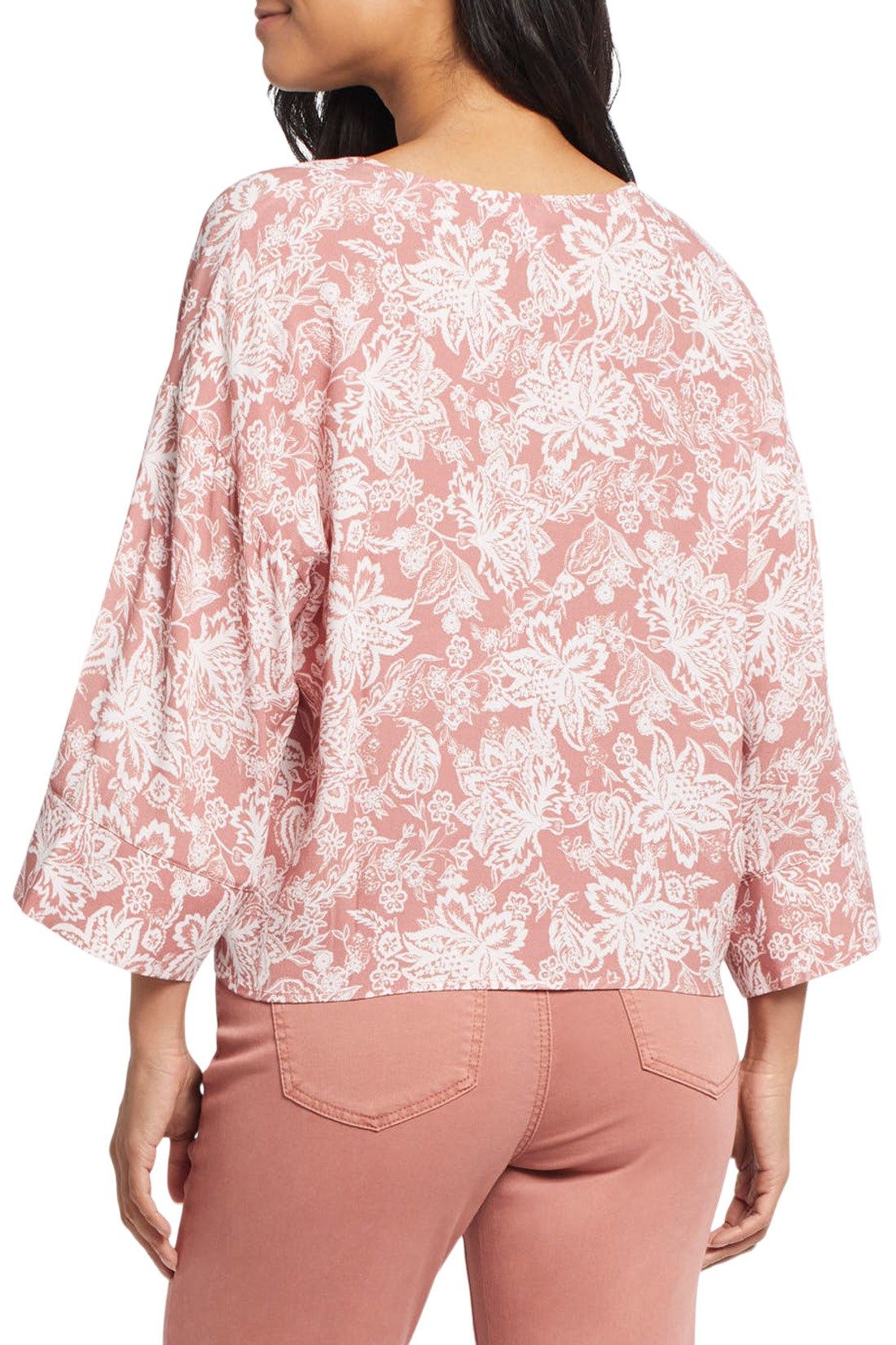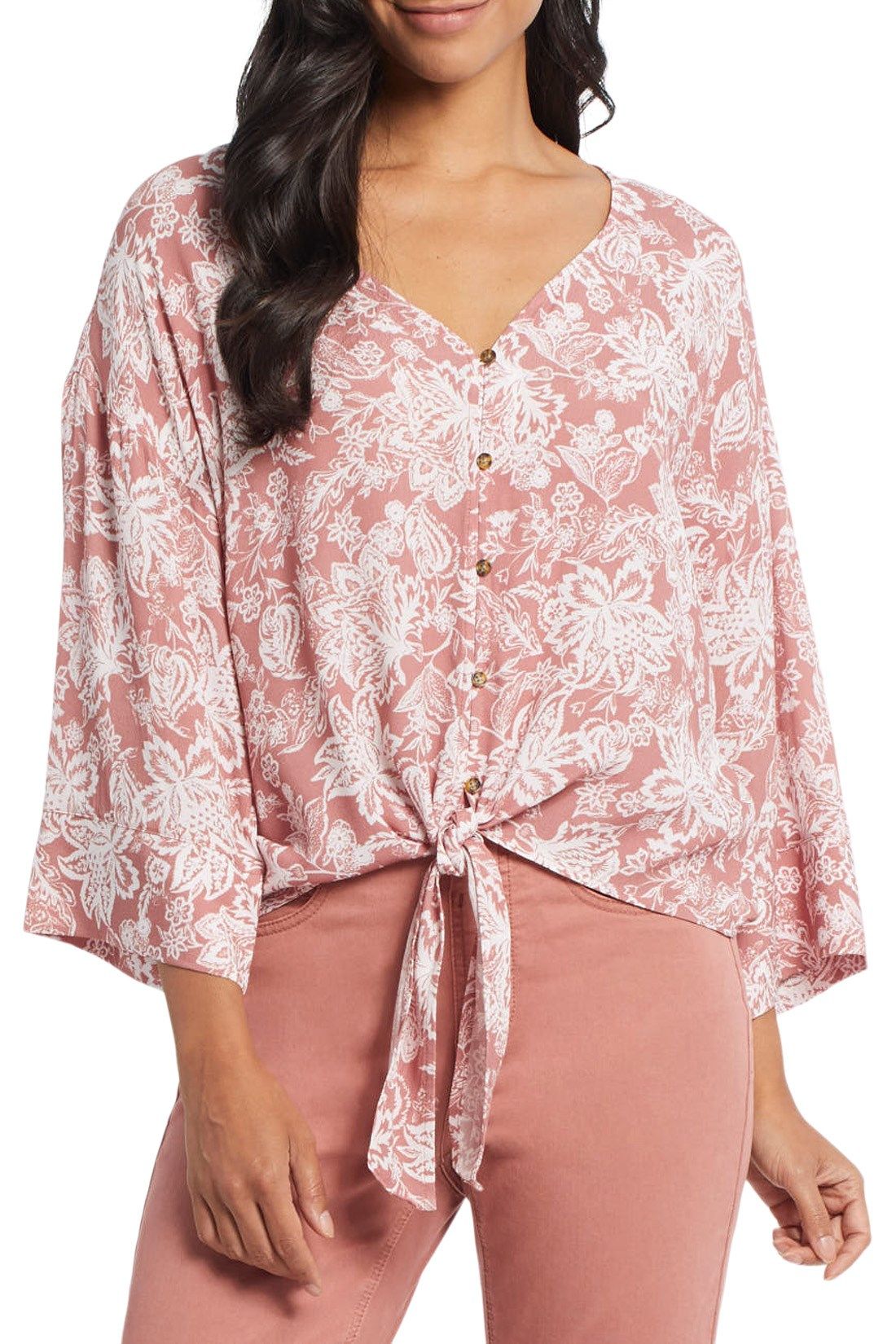 Tie-front kimono style blouse. Pair with jeans or slacks. Wedge heels or sneakers.