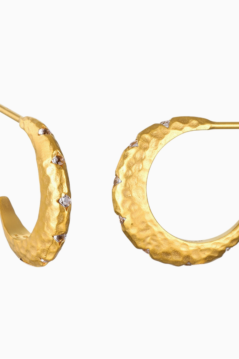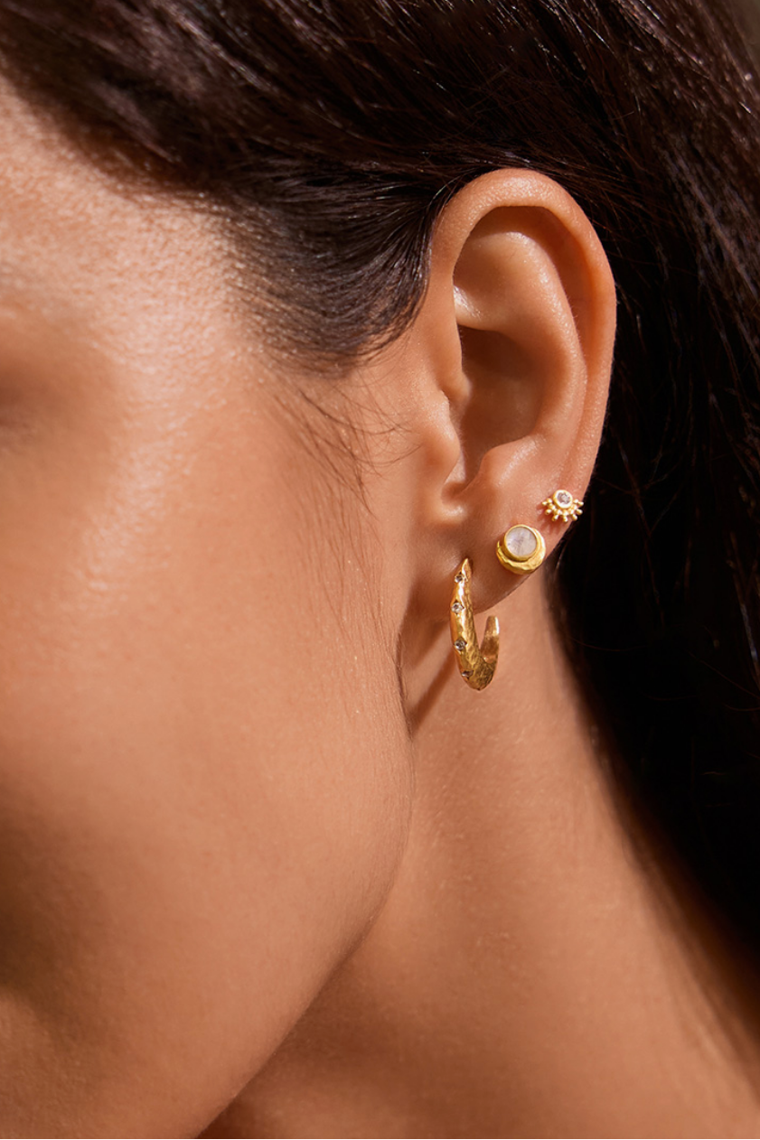 Kindred spirits recognize their light in one another; they inspire each other’s radiance. Symbolizing the goddess, nourishment, and protection, crescent moon hoop earrings in 18kt gold plate shine with starbursts of white topaz, stone of individuality, creativity, and awareness. Wear these earrings alone, or as part of your personalized ear stack.