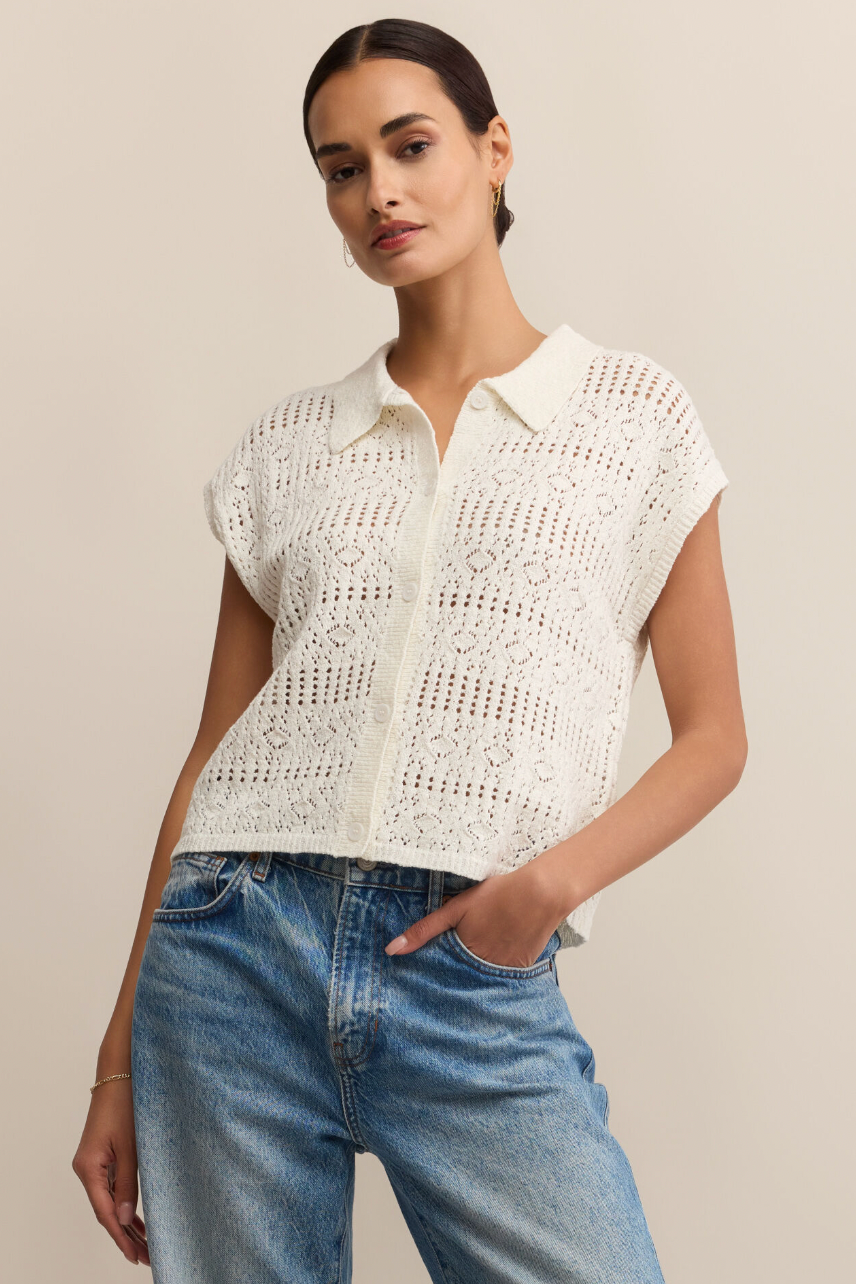 A fresh twist on a classic silhouette, the Kinsley Sweater Top features a crisp collar and button front for a touch of refined charm. Crafted in a soft knit with a regular fit, it offers just the right balance of structure and comfort. Perfect for dressing up or down, it pairs with everything from high-waisted jeans to tailored skirts for a look that's both timeless and on trend.