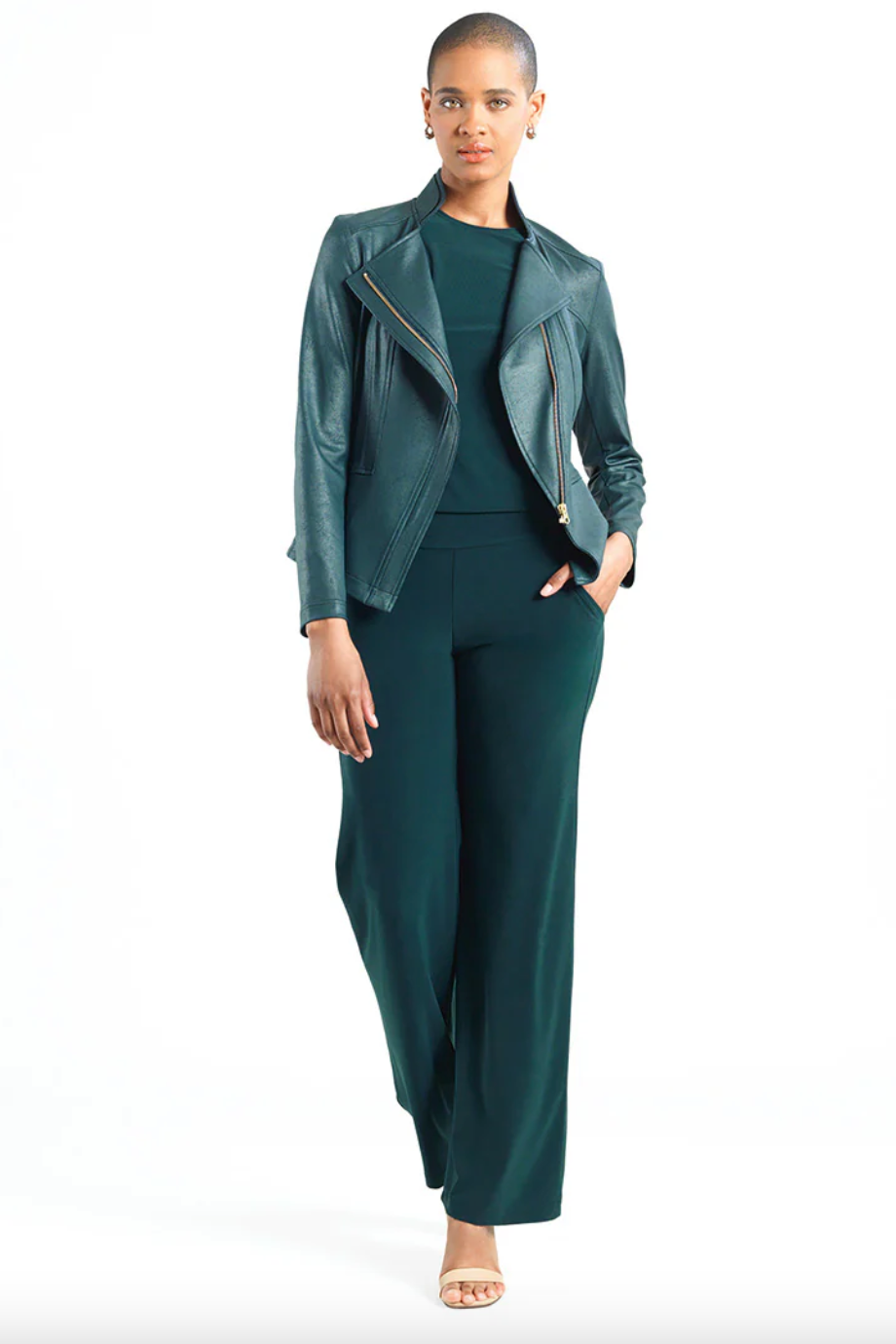 Our Hunter Green shade is a rich, deep earthy-green color comprised of both cool and warm undertones. Pair with our Classic Liquid Leather Jacket in Hunter Green.