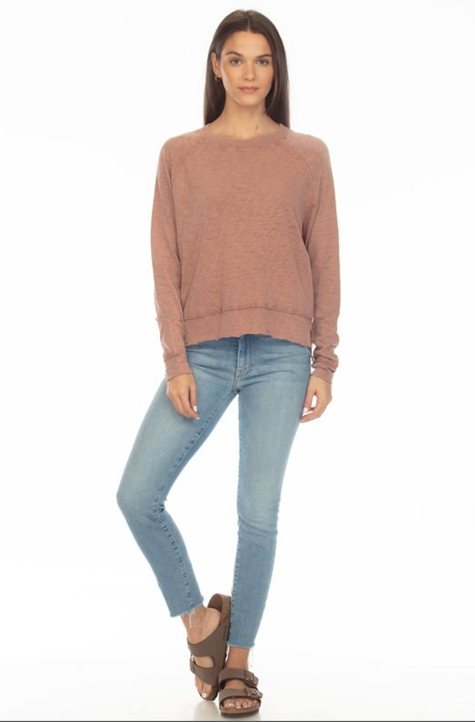 Long sleeve soft raglan tee is nutmeg. Great piece with jeans or joggers for a relaxing day.