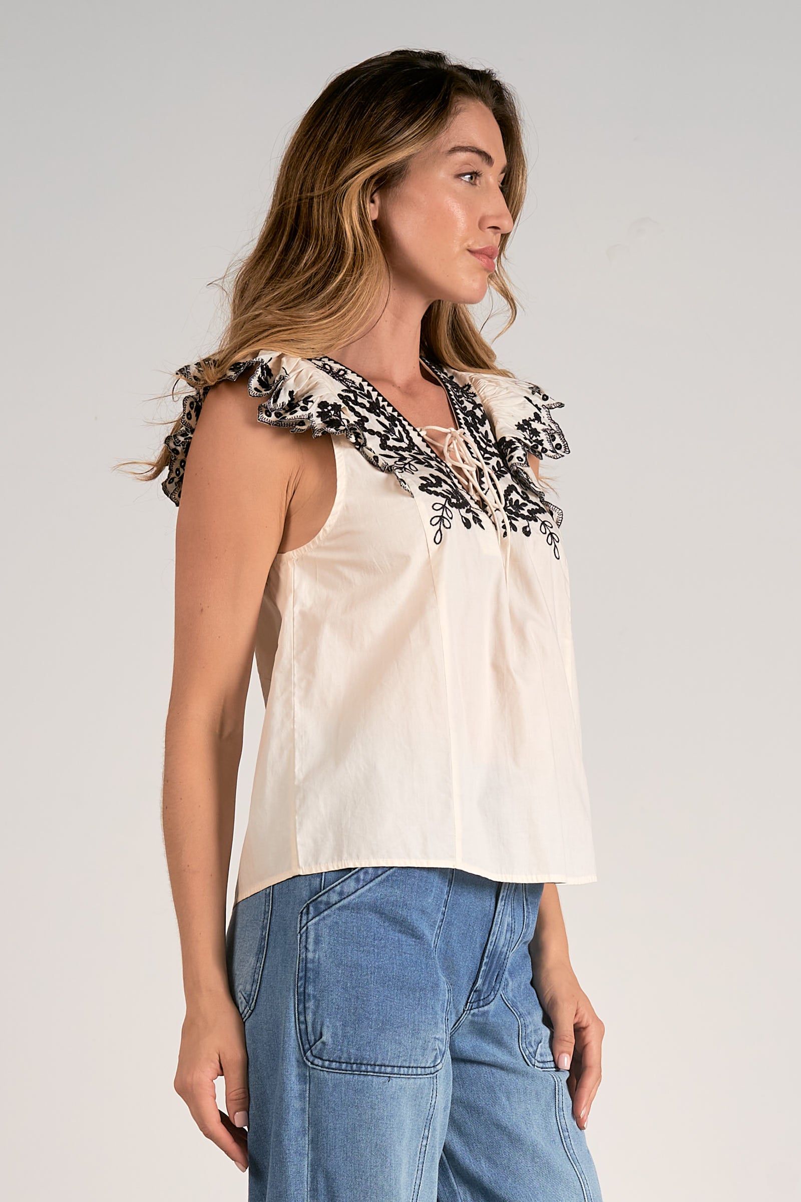 Dress up for a sunny day in this embroidered top. The embroidered detailing makes this top eye-catching, along with the ruffle sleeves, and lace-up neckline.