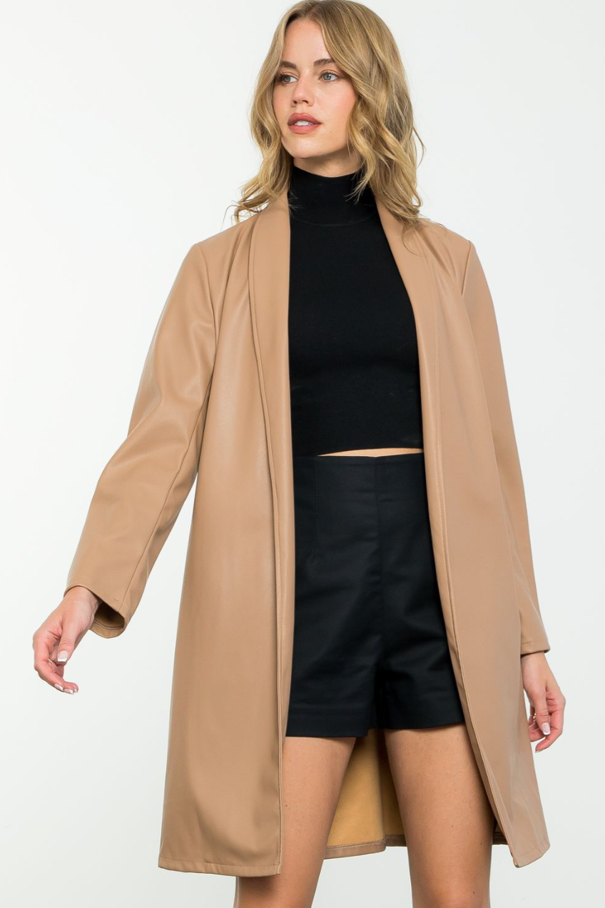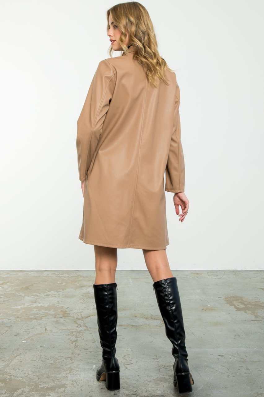 This leather coat is chic for the colder weather. This coat will elevate any look you wear and is a neutral tone that is easy to match with your outfit!