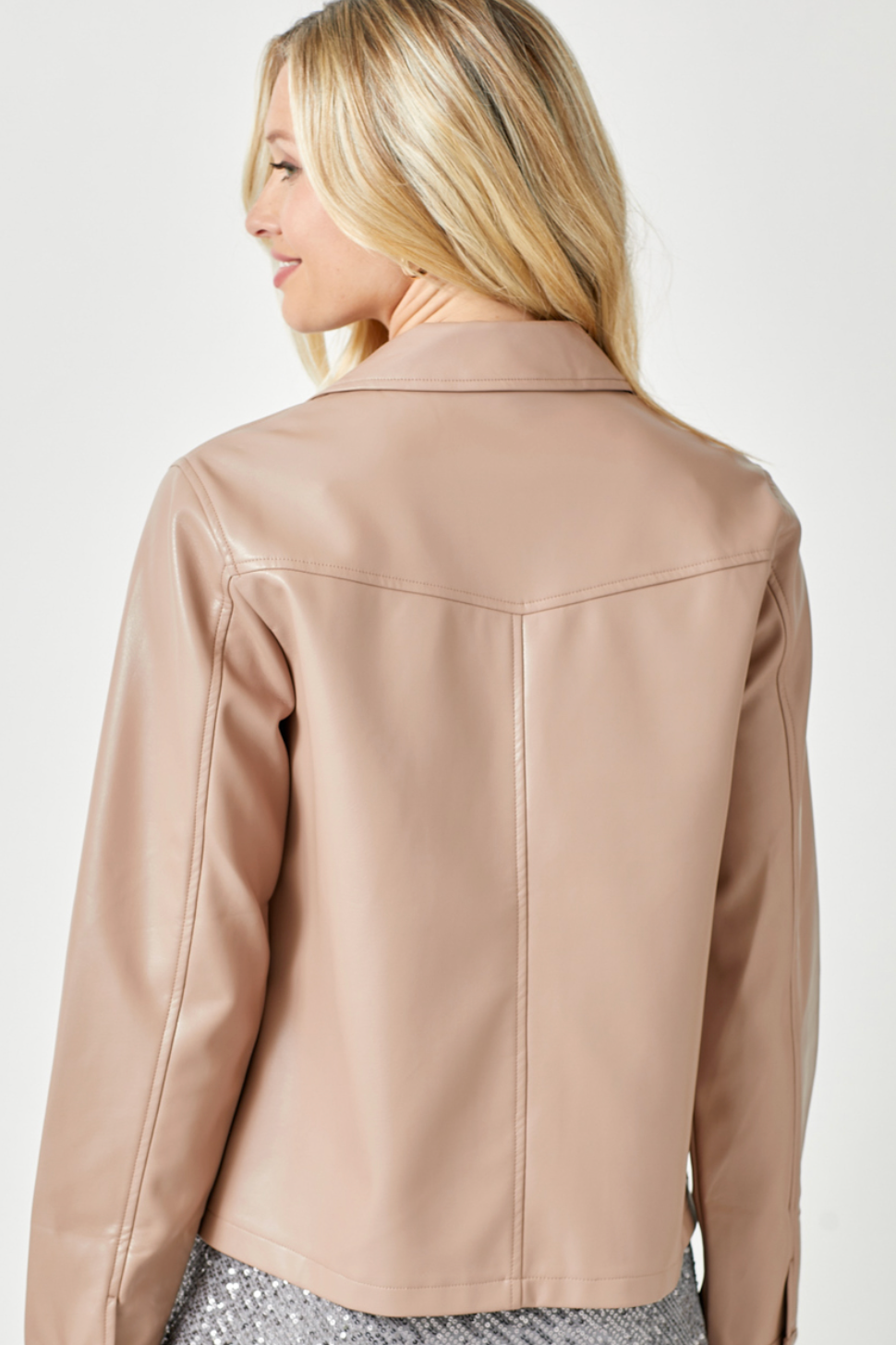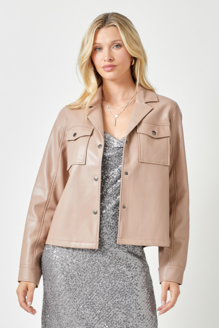 This trendy jacket is a great option to wear over an outfit. Can be dressed up or down, and is complete with pockets and a snap button closure.