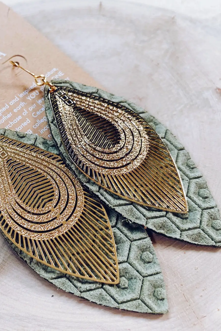 Shop our new Leather Filagree Earring Collection. Handmade in Minnesota. You plant one tree with each purchase. These lightweight earrings are made with nickel free gold plated earring hooks and genuine leather and gold plated pendants. 3" L x 1" W.
