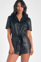 This short sleeve faux leather romper is a great addition to your closet for fall. Great for the days when it is still warm! Can be worn casually or dressed up.