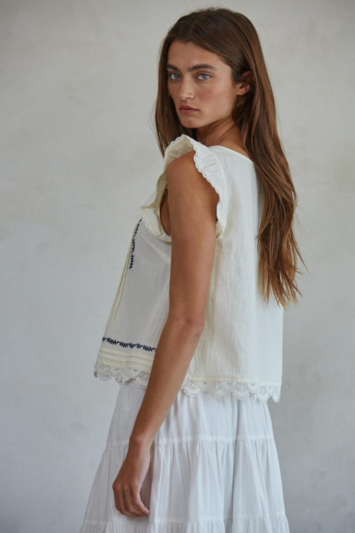 Woven Cotton Embroidered Lace Trim Details V-Neck Button Down Ruffle Sleeveless Top