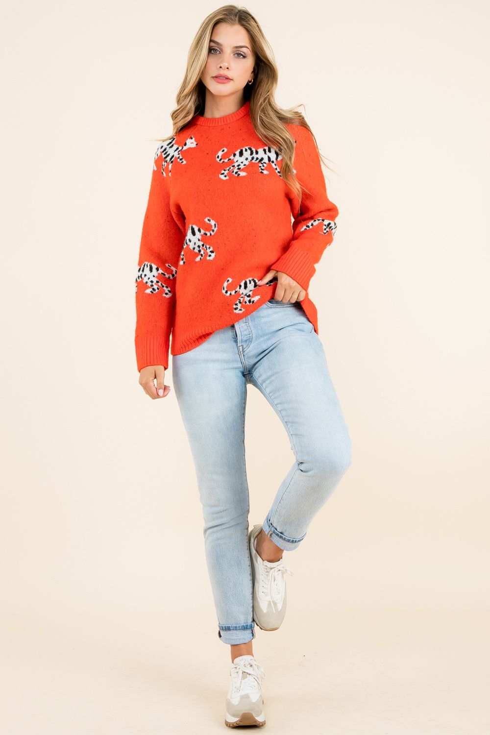 This red leopard pattern sweater is a statement sweater. Pair with jeans or basic fall bottoms for a balanced look.