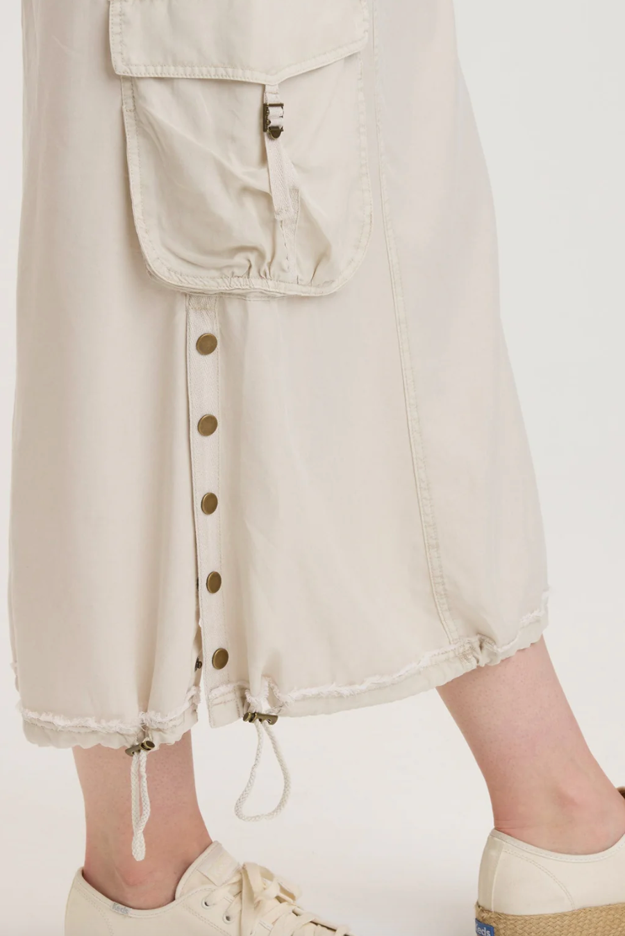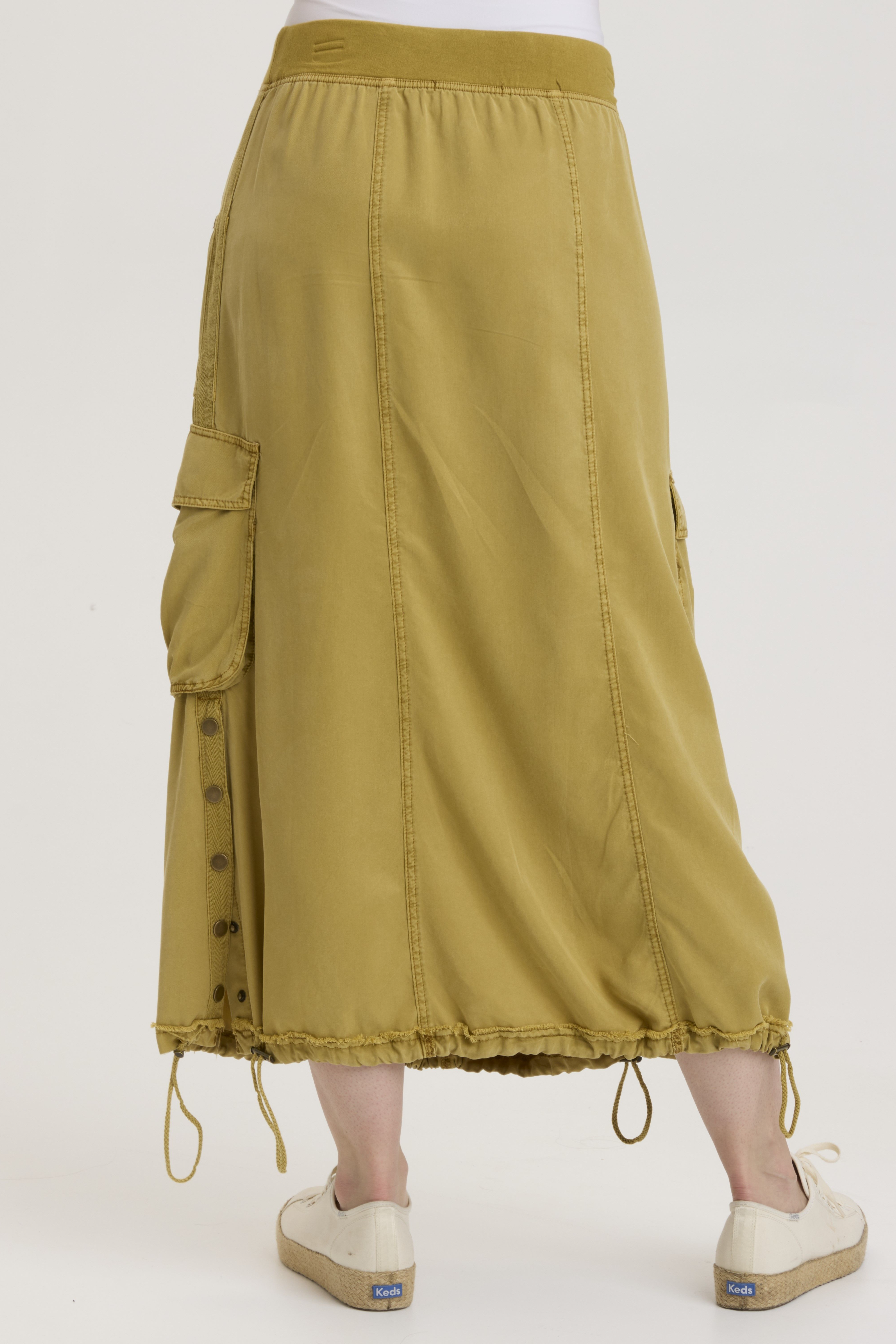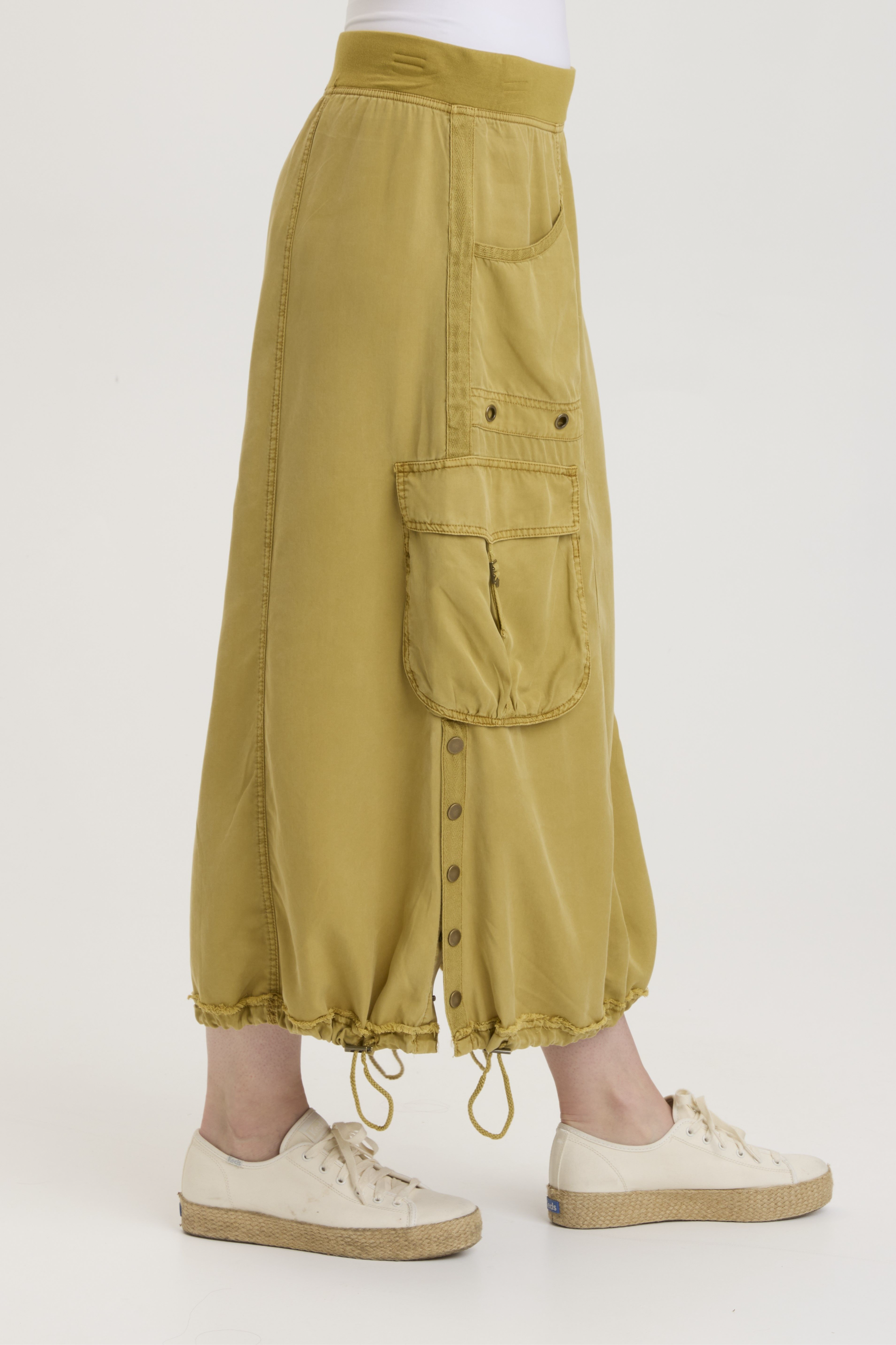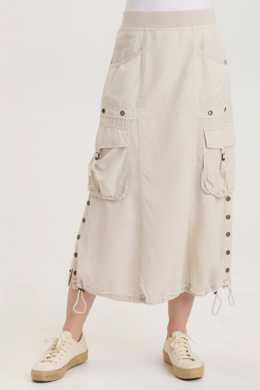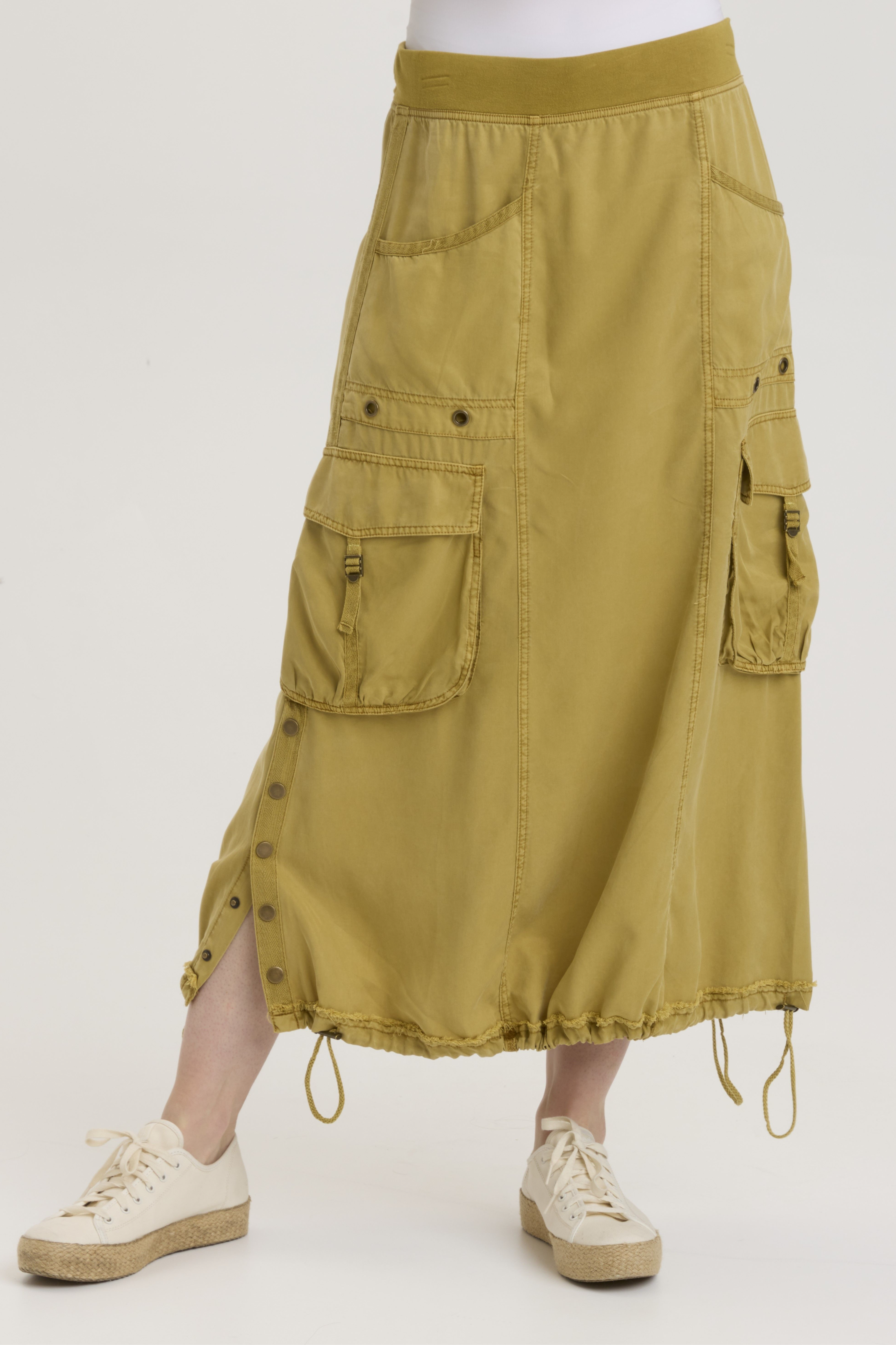 Do you like huge awesome cargo pockets? We do too! And Leslyn does not disappoint. Featuring exaggerated cargo pockets a snap-up side split and a cinchable bubble hem, this pull-on waist, front pocket skirt is guaranteed to spice up your life!