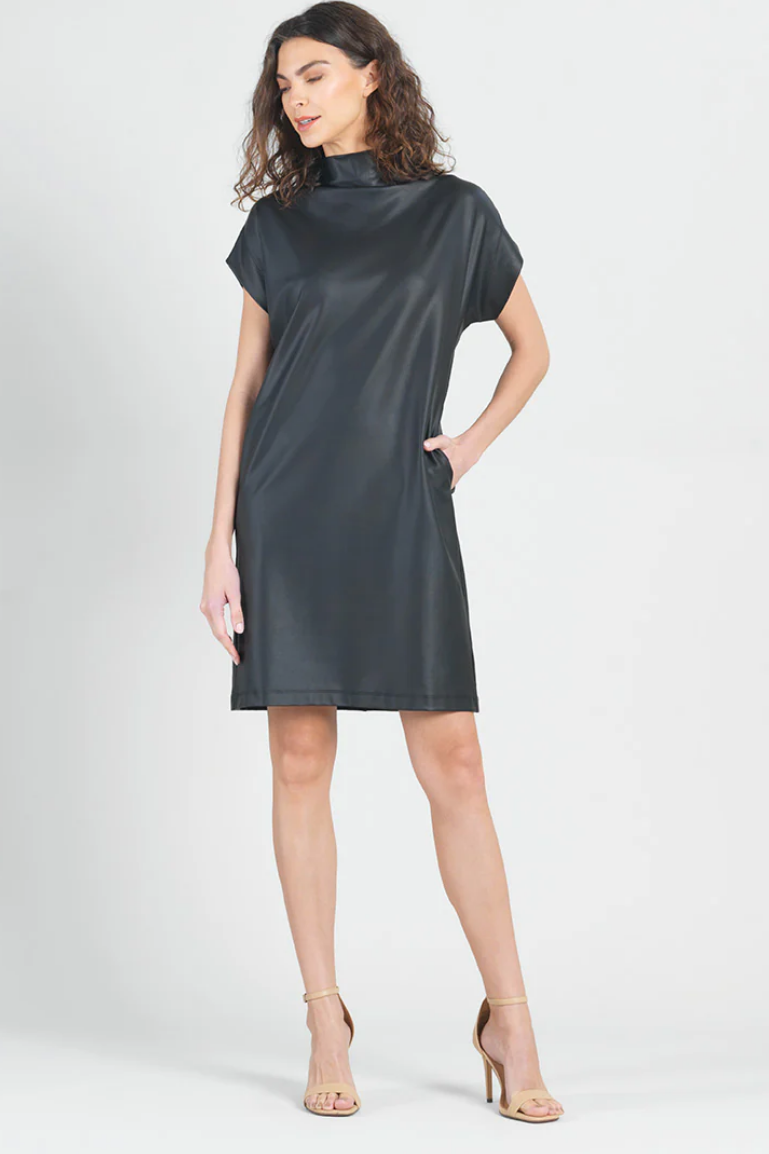 The Liquid Leather™ - High Neck Tunic Pocket Dress is tunic style dress capturing a feminine edgy style. This dress features a high neckline, dolman cap sleeves, and side pockets.