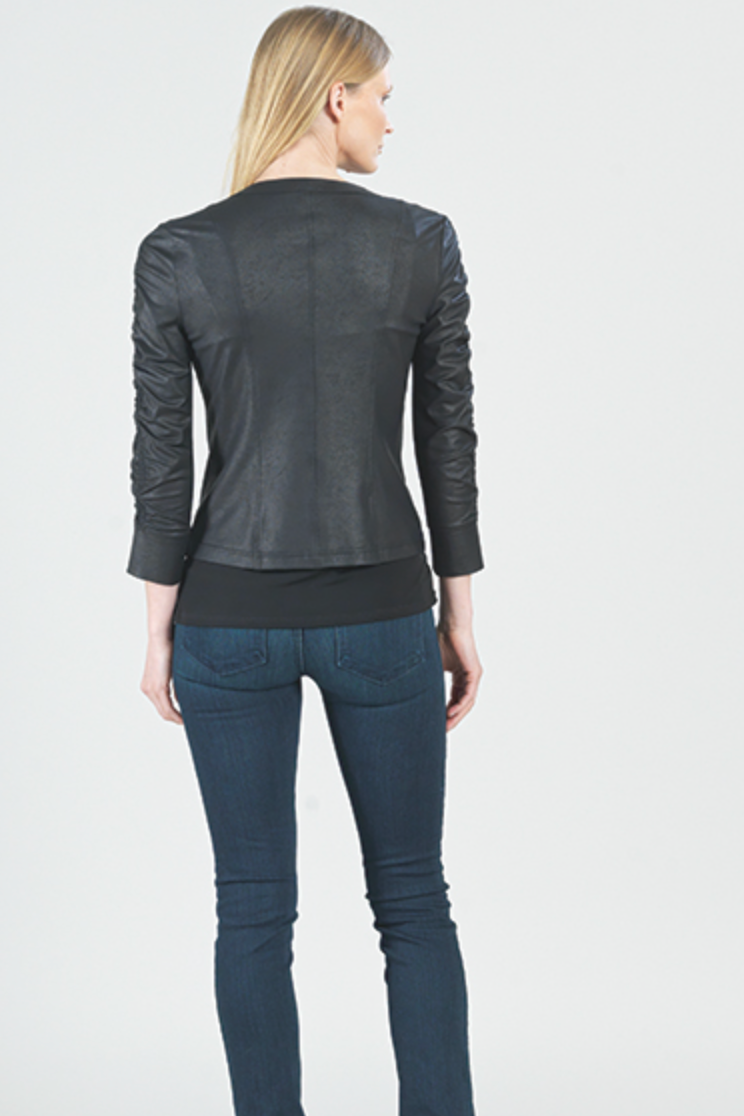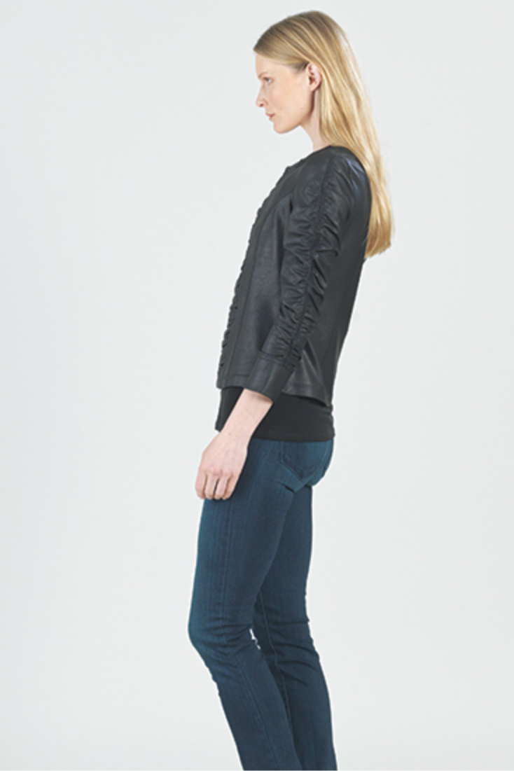 Experience our unique Liquid Leather Ruched Detail Jacket which is made from our beautiful signature stretch knit, extremely lightweight soft "lambskin feel" fabric with an antique-like textured matte finish. This no collar jacket features 3/4 length ruched sleeves, a rustic gold vertical zip closure with ruched details surrounding it, and flattering front and back stitching.