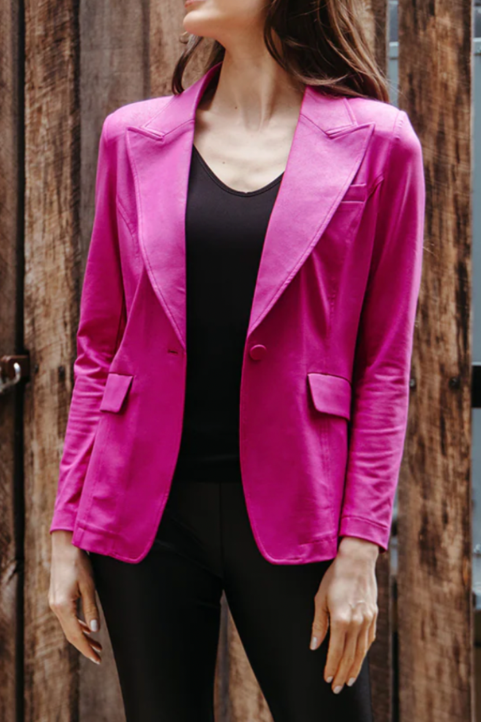 Blaze your own fashion trail in our Liquid Leather Signature Pocket Blazer, which is tailored to perfection! Made from our beautiful signature stretch knit, extremely lightweight soft "lambskin feel" fabric with an antique-like textured matte finish. This blazer features a fold-over collar with a notched lapel, inner shoulder pads, long sleeves with 4-button cuff detail, single button closure, two standard front pockets, one mini chest pocket, and a center back seam with a vented hemline.