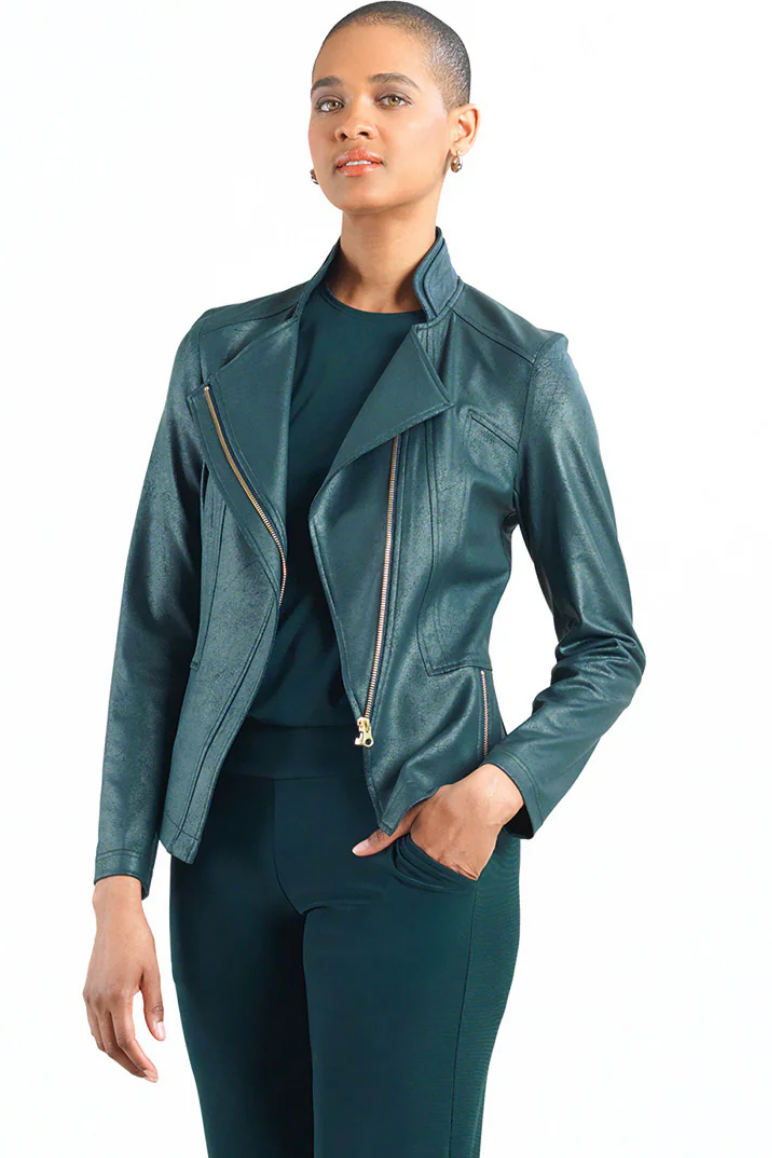 Back by popular demand our highly requested Liquid Leather Zip Jacket. This faux leather jacket is made from our beautiful signature soft stretch, lightweight fabric and features a notched lapel with upright collar, soft "lambskin feel" sleeves, a rustic gold a-symmetrical zip closure and faux pocket slits. The interior is made from soft knit giving it the right amount of stretch providing you with breathable superb wear.