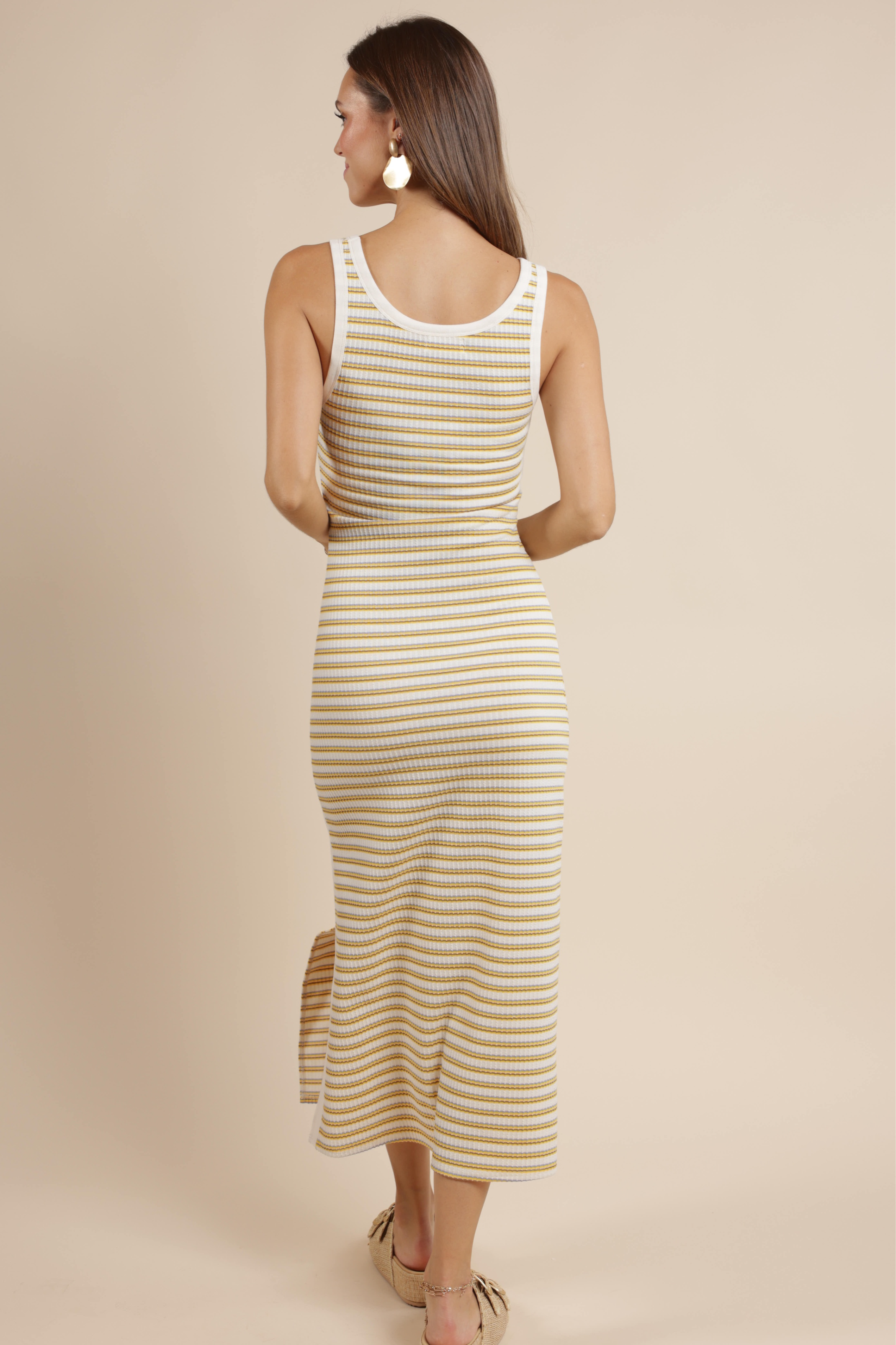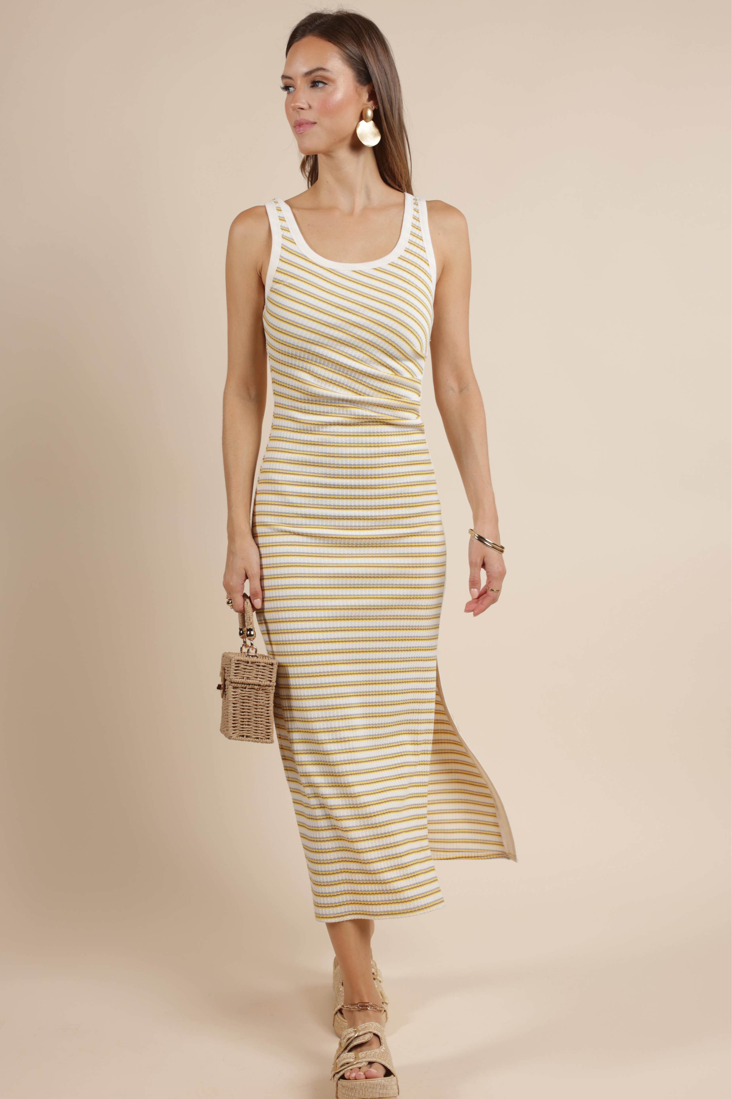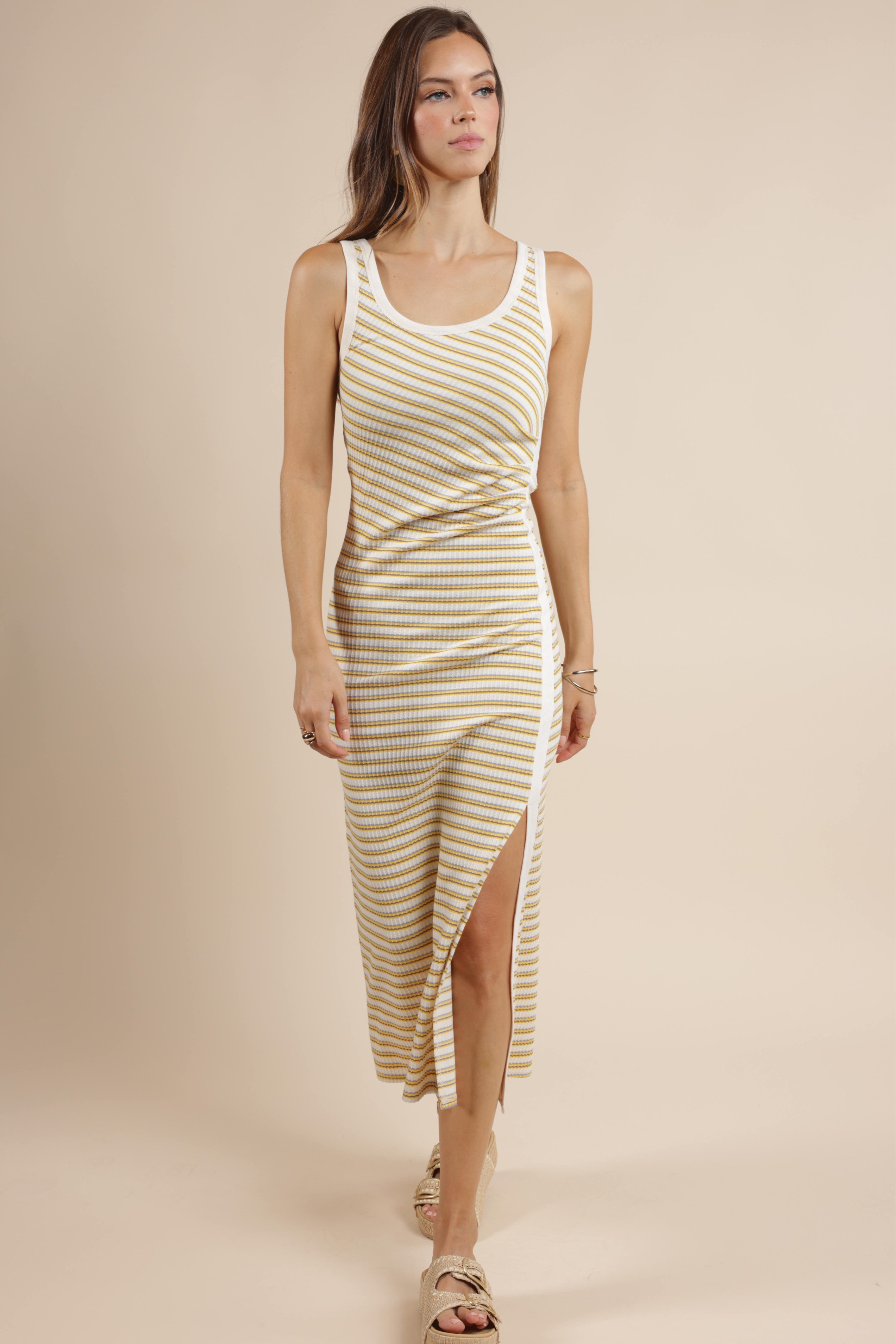 The Little Things Ruched Stripe Knit Dress is a versatile and comfortable piece for everyday wear. This dress has a fitted silhouette that extends into a midi-length skirt. The ruched detail with an adjustable drawstring on the side creates a gathered effect, adding texture and shape to the design.