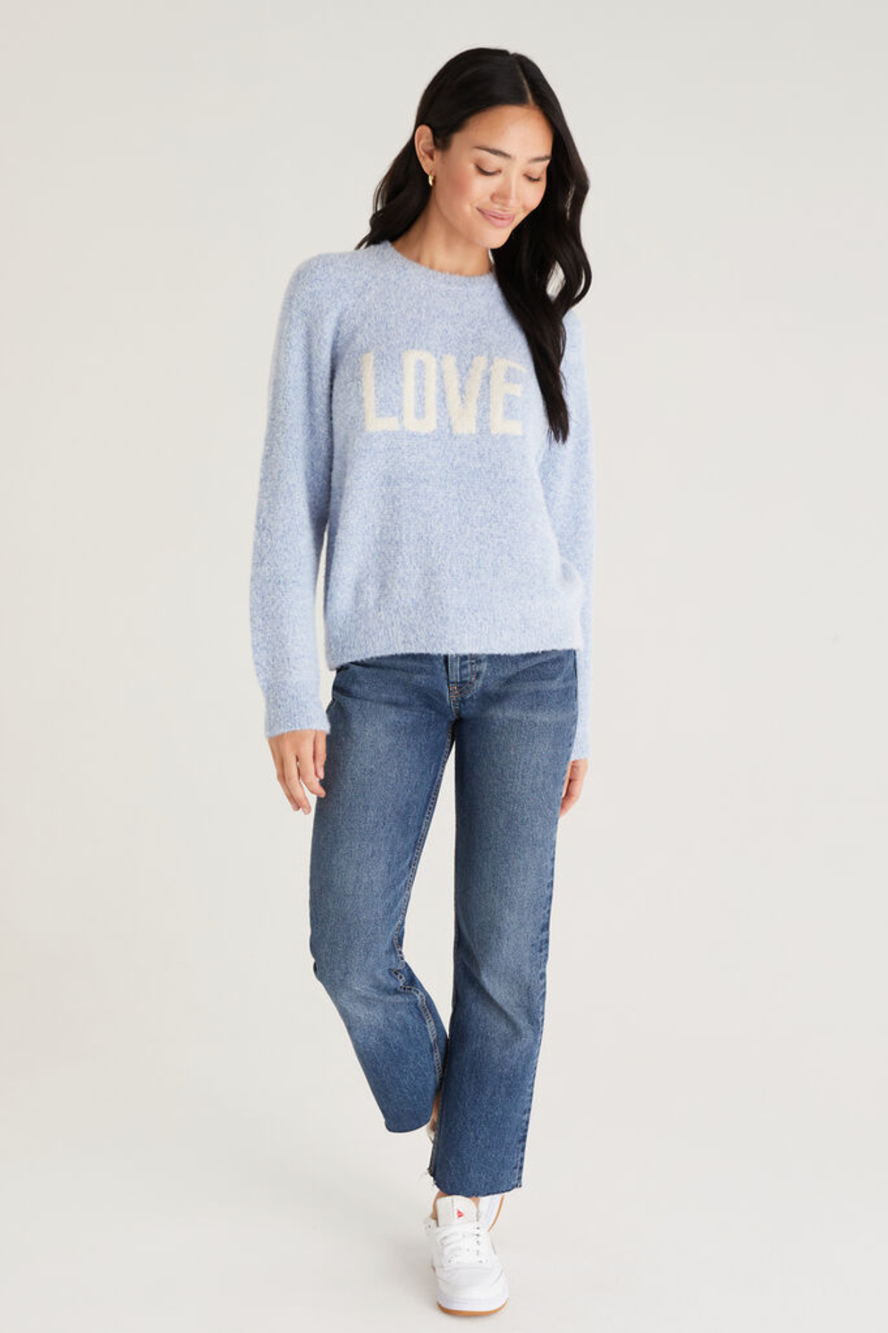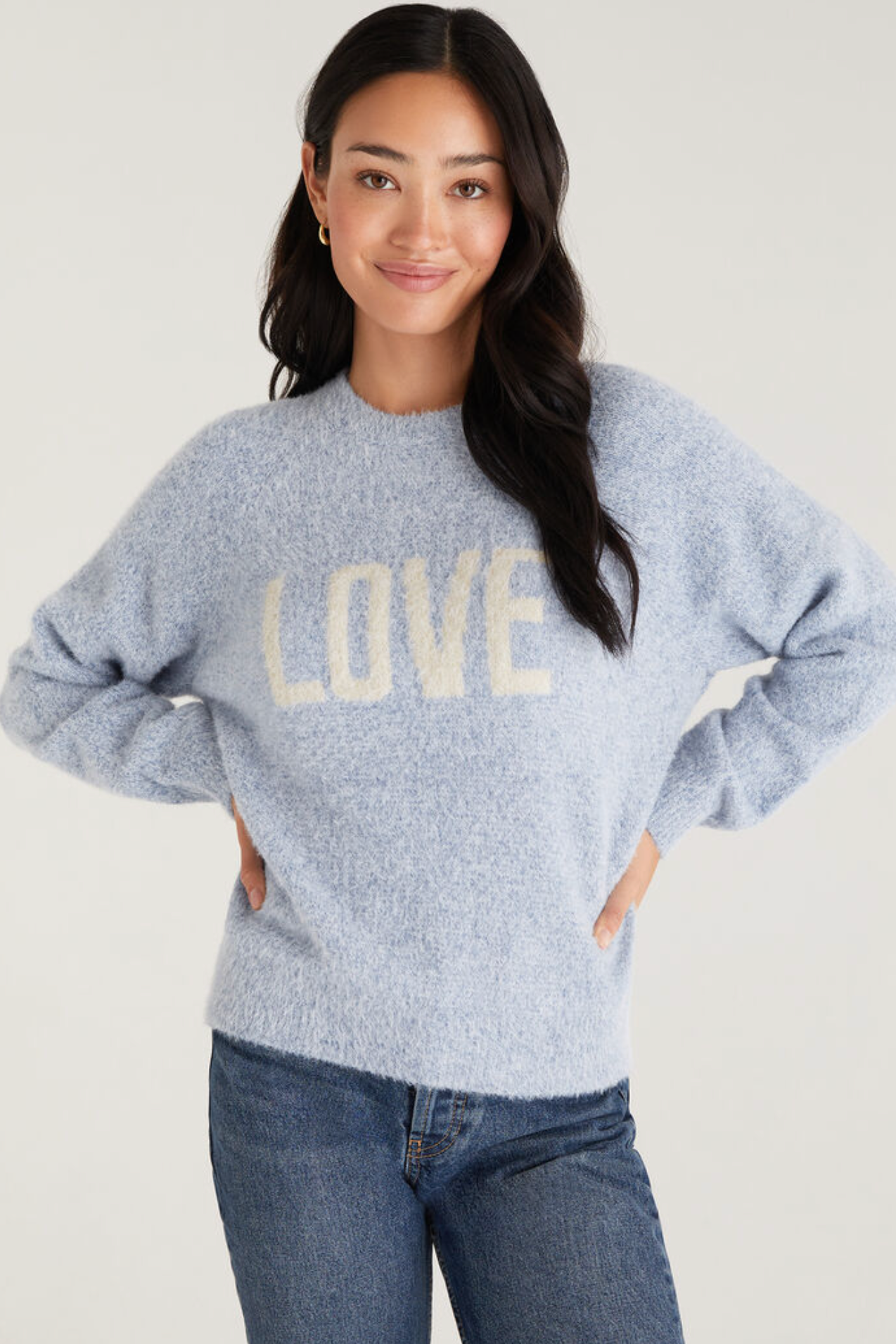 The Lizzy Love Marled Sweater is here, ready to complete her look and keep her cozy. This medium-gauge sweater has a below-waistband, easy fit and is offered in our Ocean color with LOVE intarsia on the front.