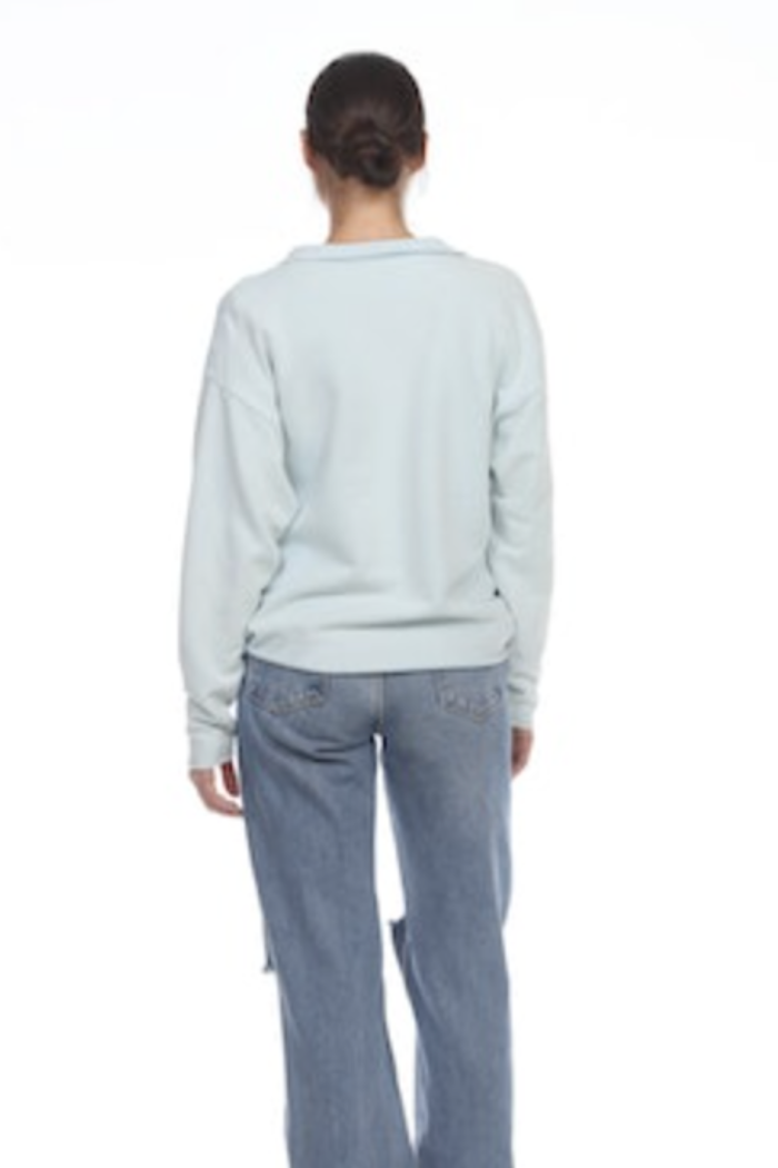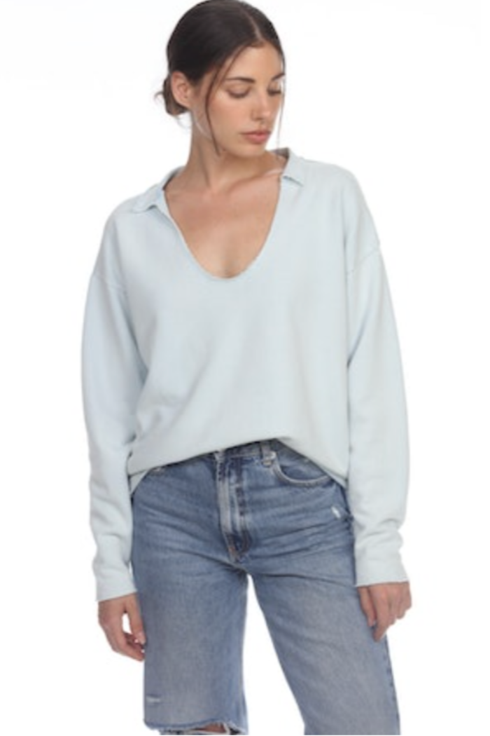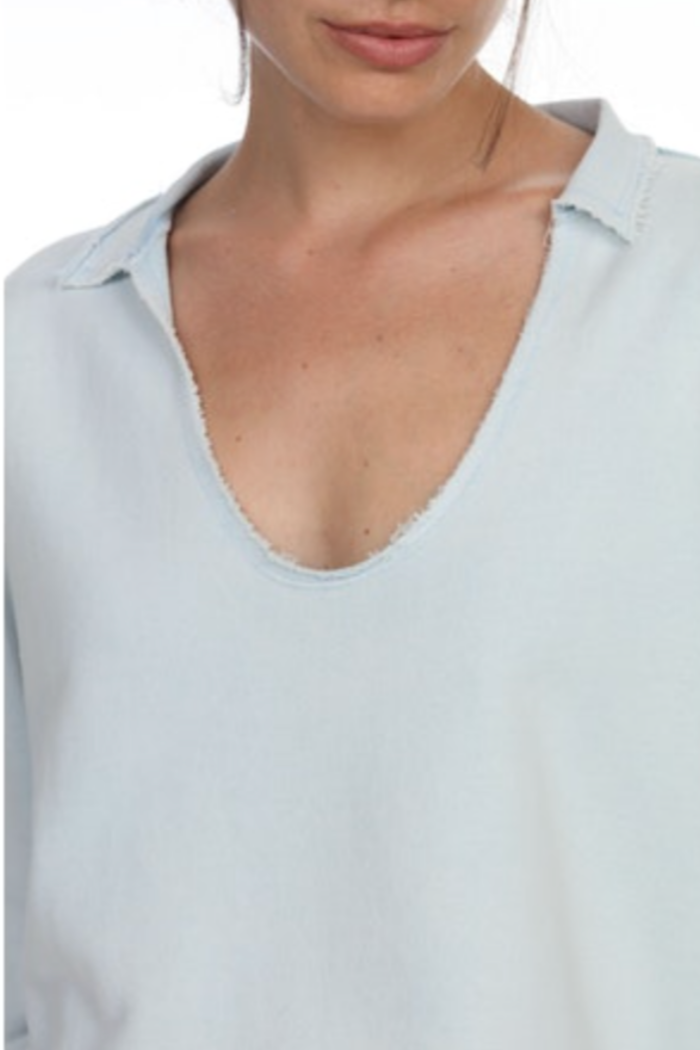 This long sleeve has a soft v-neck and a subtle collar detail. Easy to pair with leggings or jeans. Makes a great closet staple.