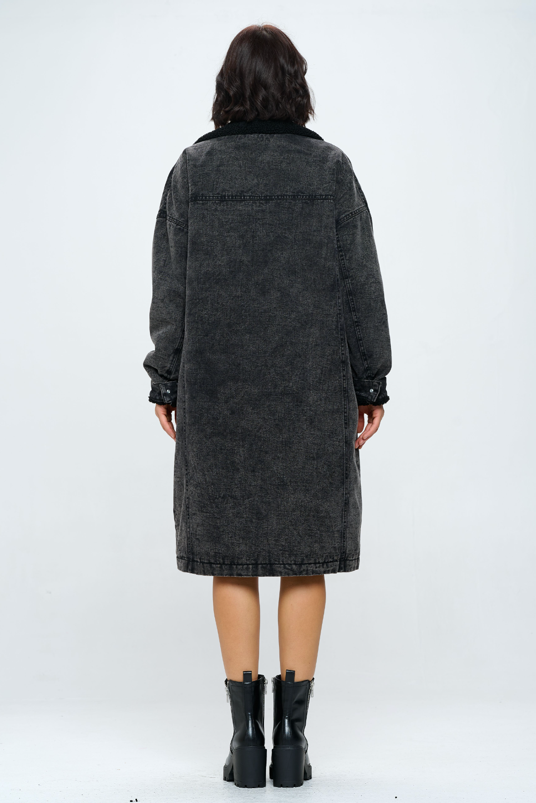 This long denim jacket is super fun and the sherpa lining makes it super cozy to wear. Looks great with some chunky fall boots and a beanie for a perfect fall look.
