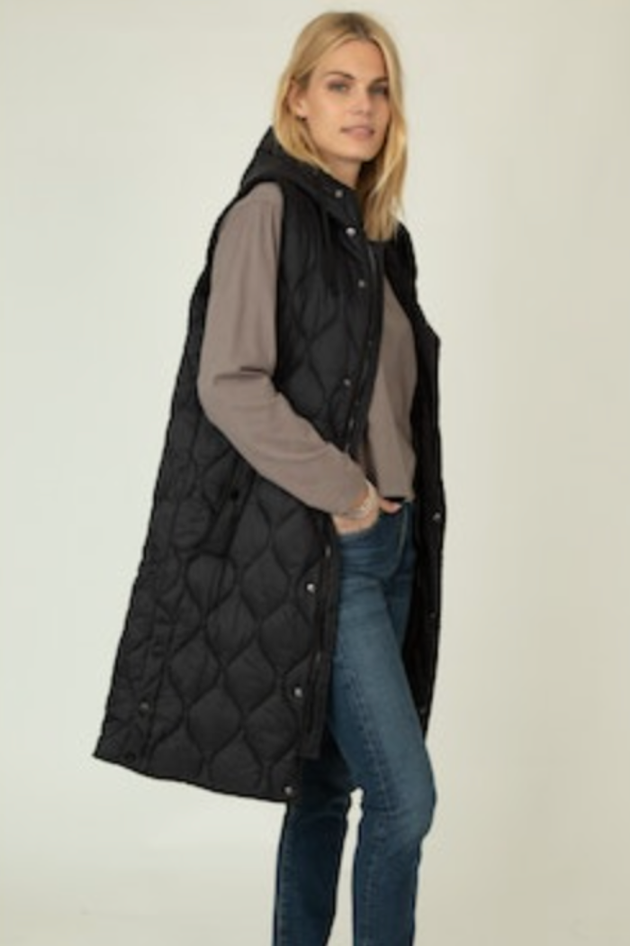 This long puffer vest is super cozy. A great travel vest and easy to layer with a fitted long sleeve top or sweater.