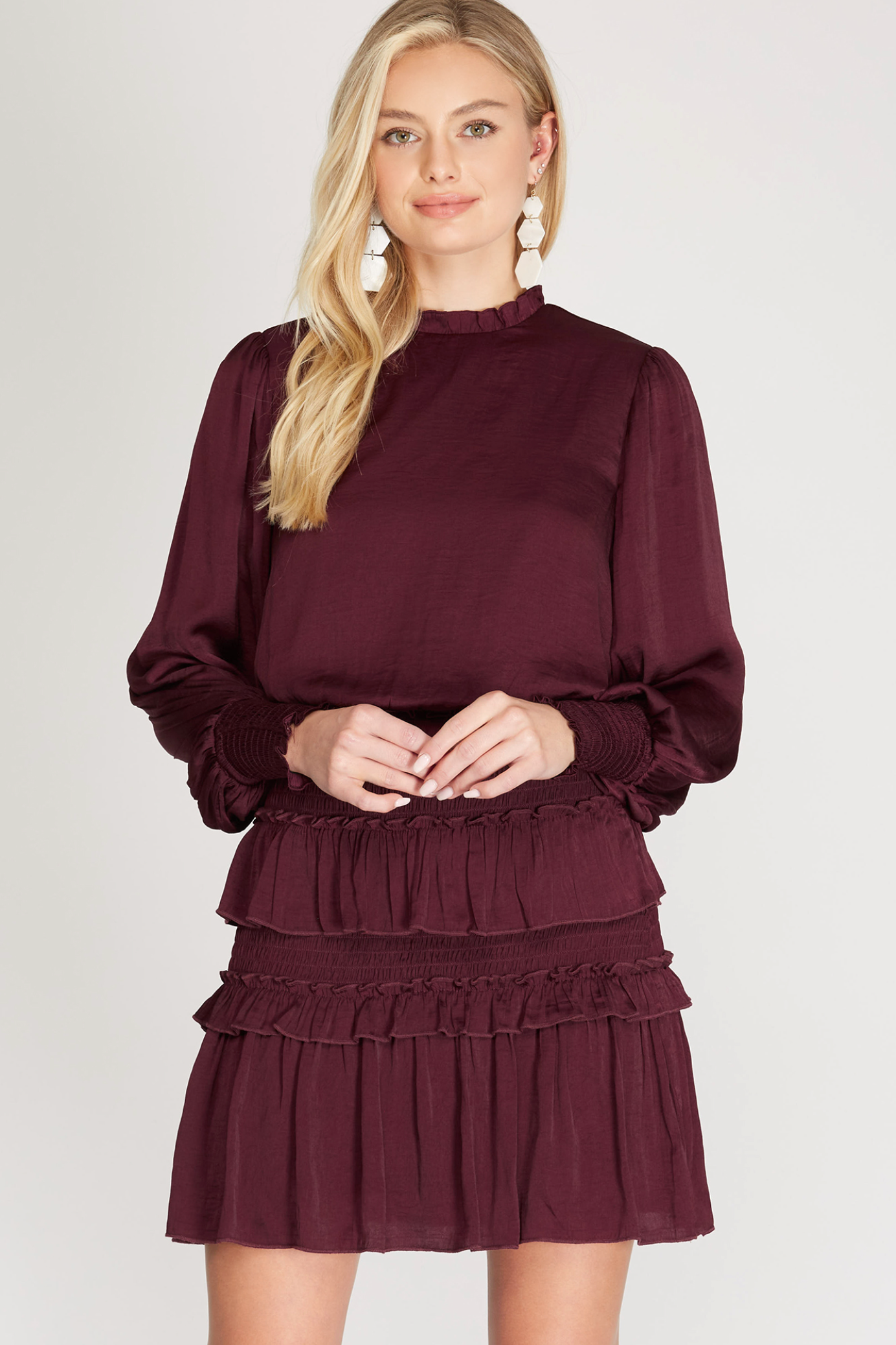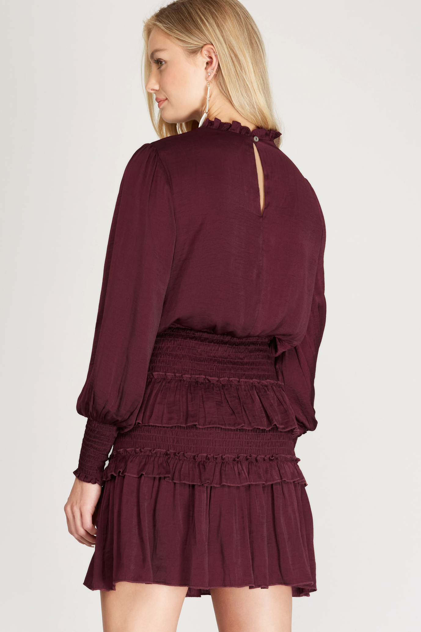 Long sleeve satin dress with a smocked waist. Super flattering and perfect for Fall and Winter get togethers.