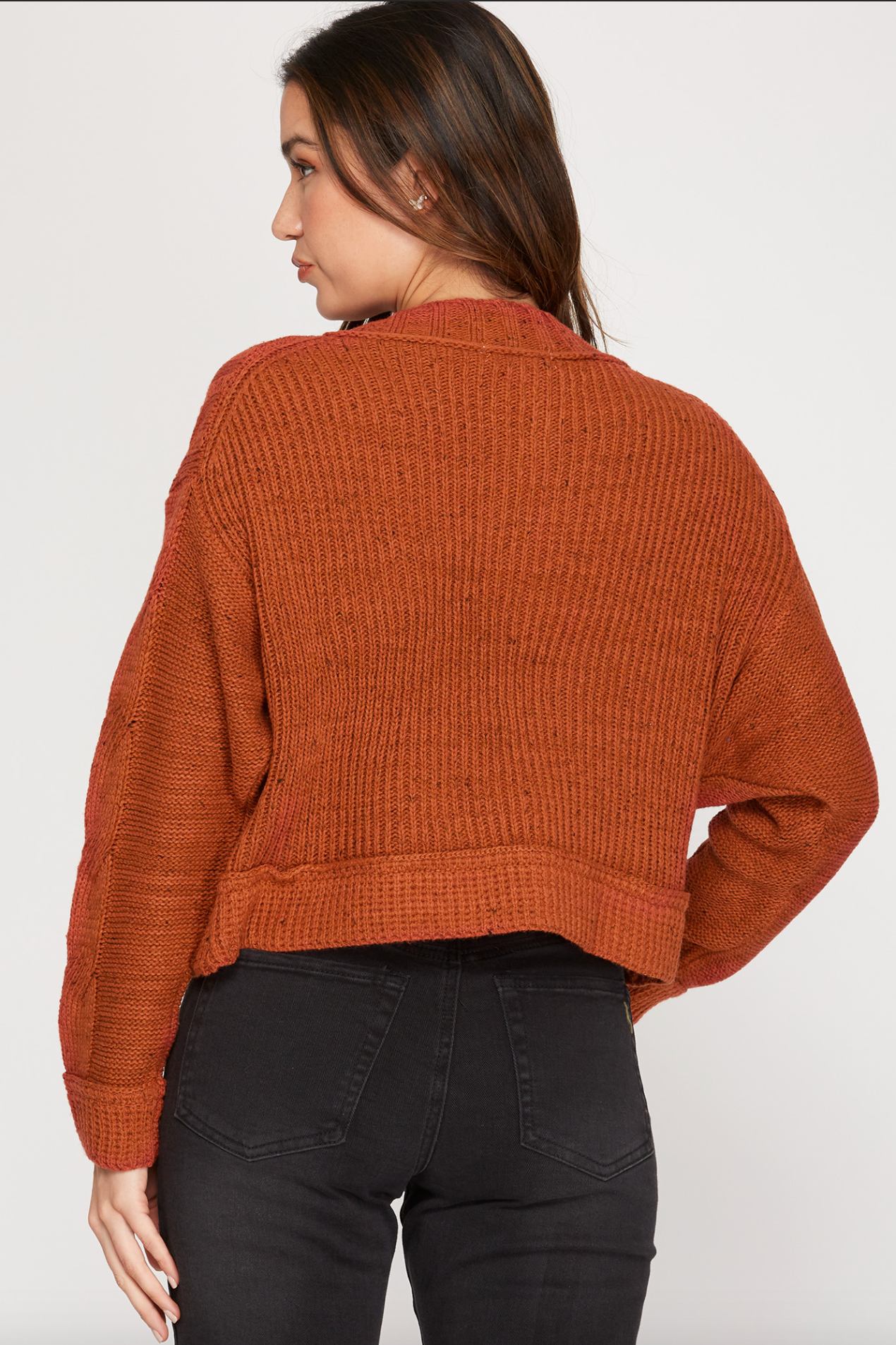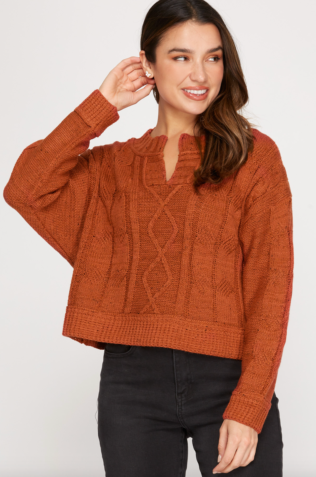 This cable knit sweater is super comfy and a great fall color. Looks great with either a denim or black bottom. Great to layer with a nice fall vest and scarf.