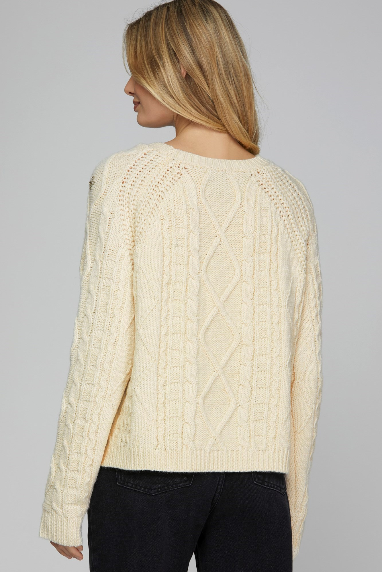 Long Sleeve Cable Knit Sweater w/ Rhinestone Detail