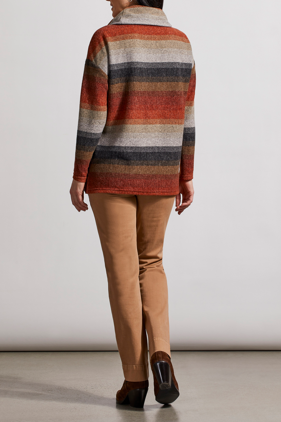 These colors for the cooler season are so warming matched with the softest feel. Cowl neck completes the cozy. Pair with jeans or solid pants.