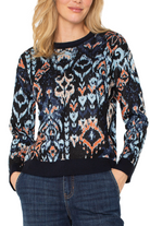 Ikat print with a fun boho feel. Comfy & casual. This sweater can be paired with a solid a line skirt or denim jeans.