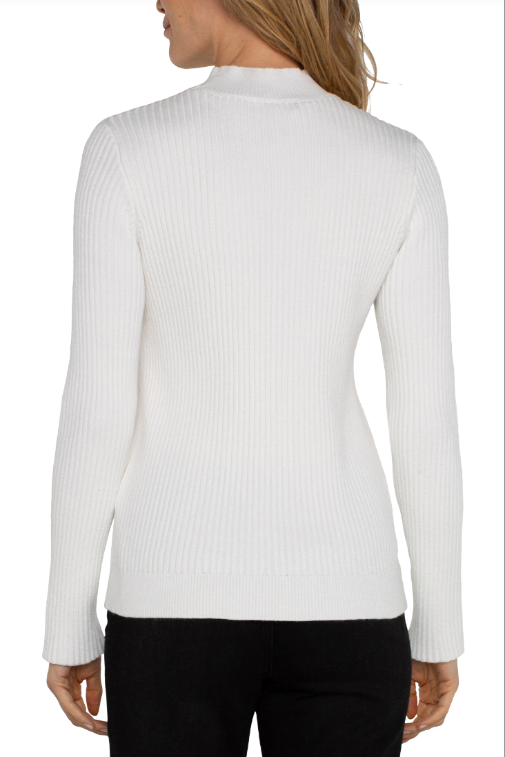 Long sleeve, mock neck sweater with cable and rib detail throughout. The porcelain color highlights the cable detail and elevates this sweater from a basic to a must have.
