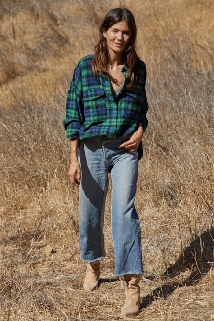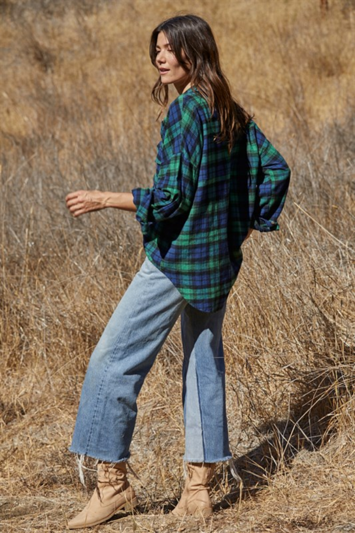 The classic flannel look. Oversized for comfort, this button front top is perfect for the cooler weather. Either worn as a jacket or top.