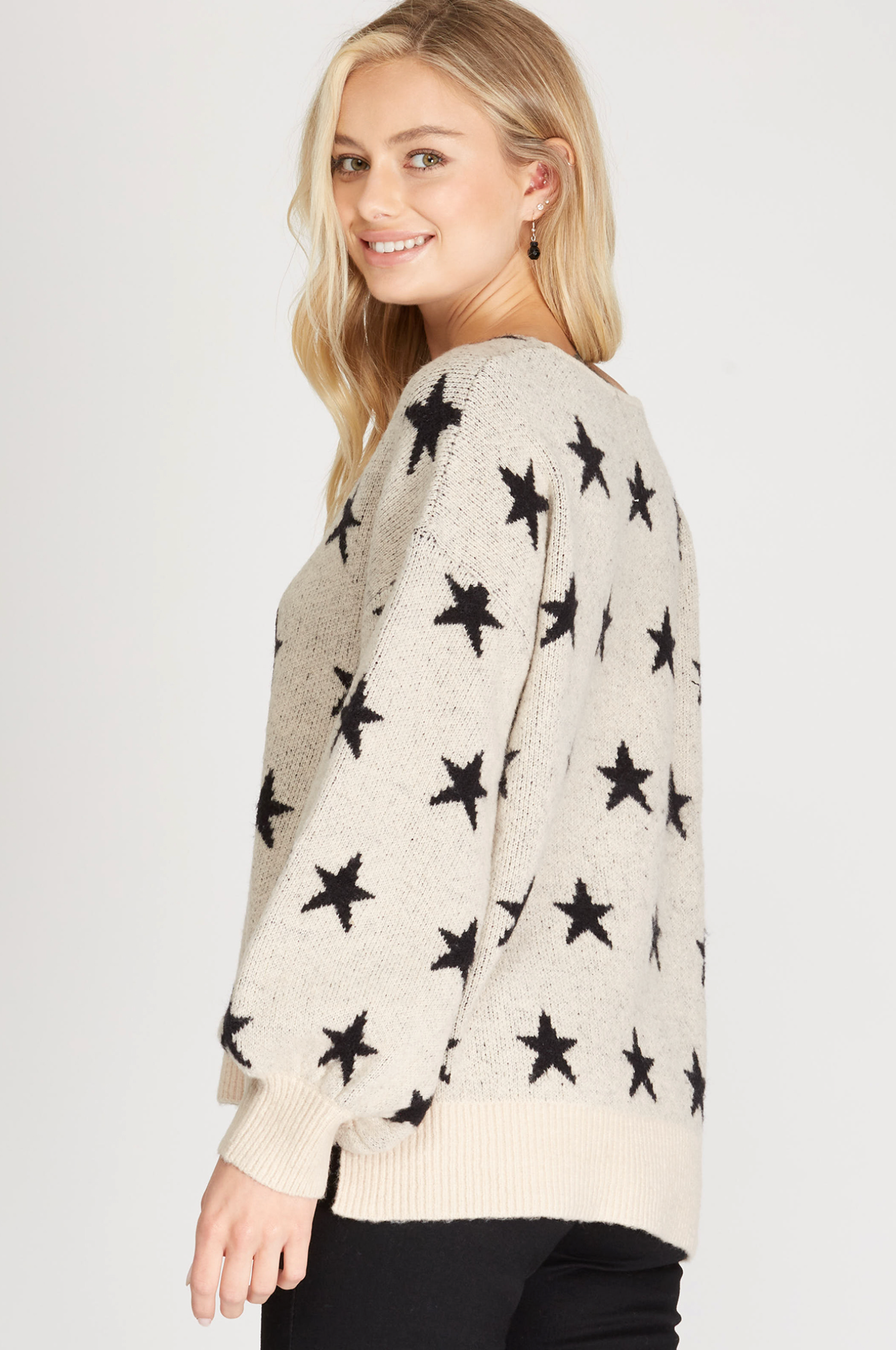 This v-neck sweater has a star print that gives it a little edgy look. Easy to wear for a casual day with jeans and sneakers or boots.