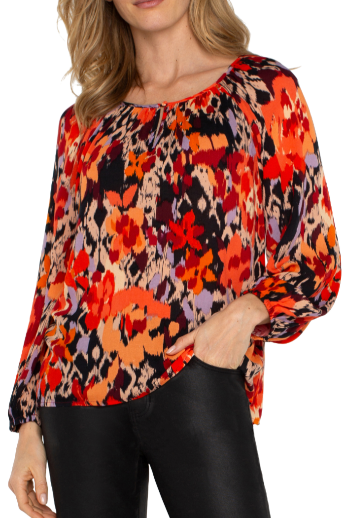 Fall floral blouse with a shirred neckline and button. Sleeves are relaxed elastic.