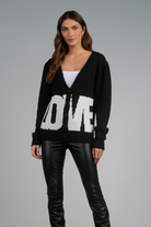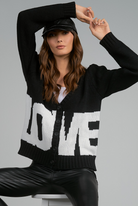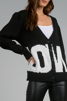 This black and white button down sweater is cozy and basic. The statement love print is towards to lower half of the sweater. Looks great worn open or closed.