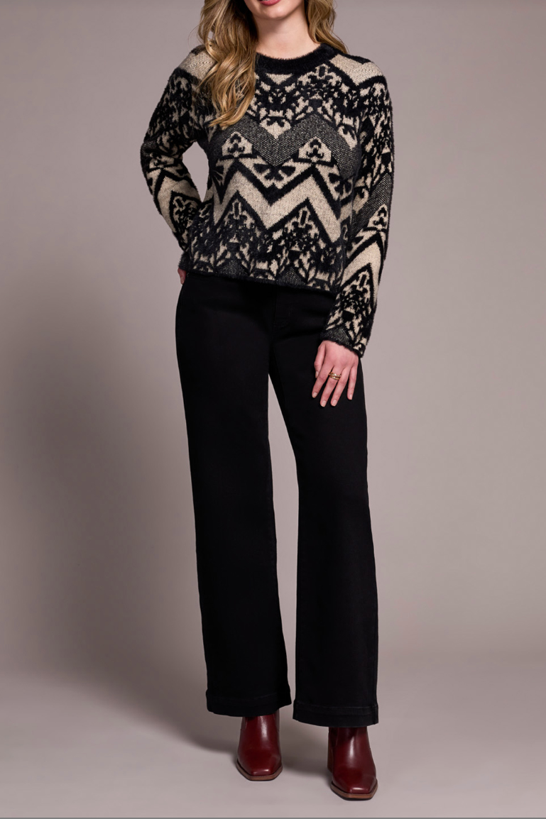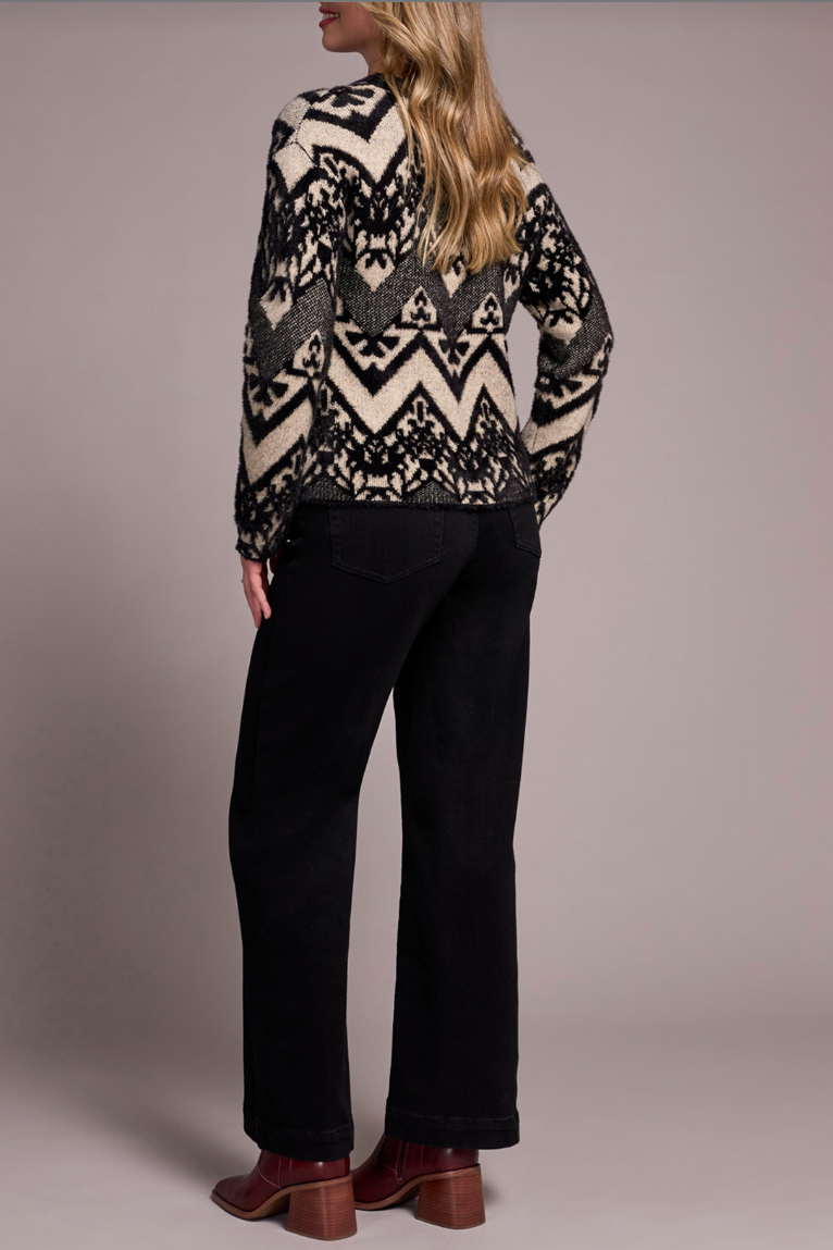 The sweater that goes with everything and you will wear again and agin. Long sleeve crew neck sweater in black and taupe with full pattern front and back.