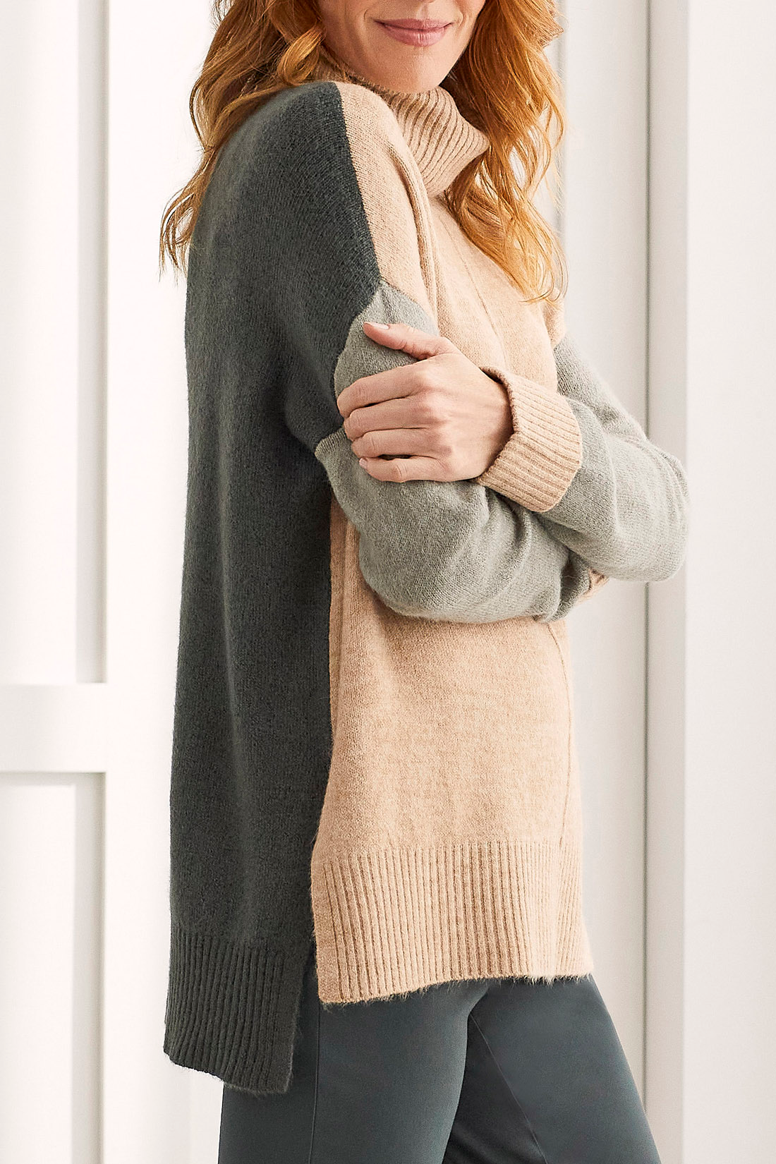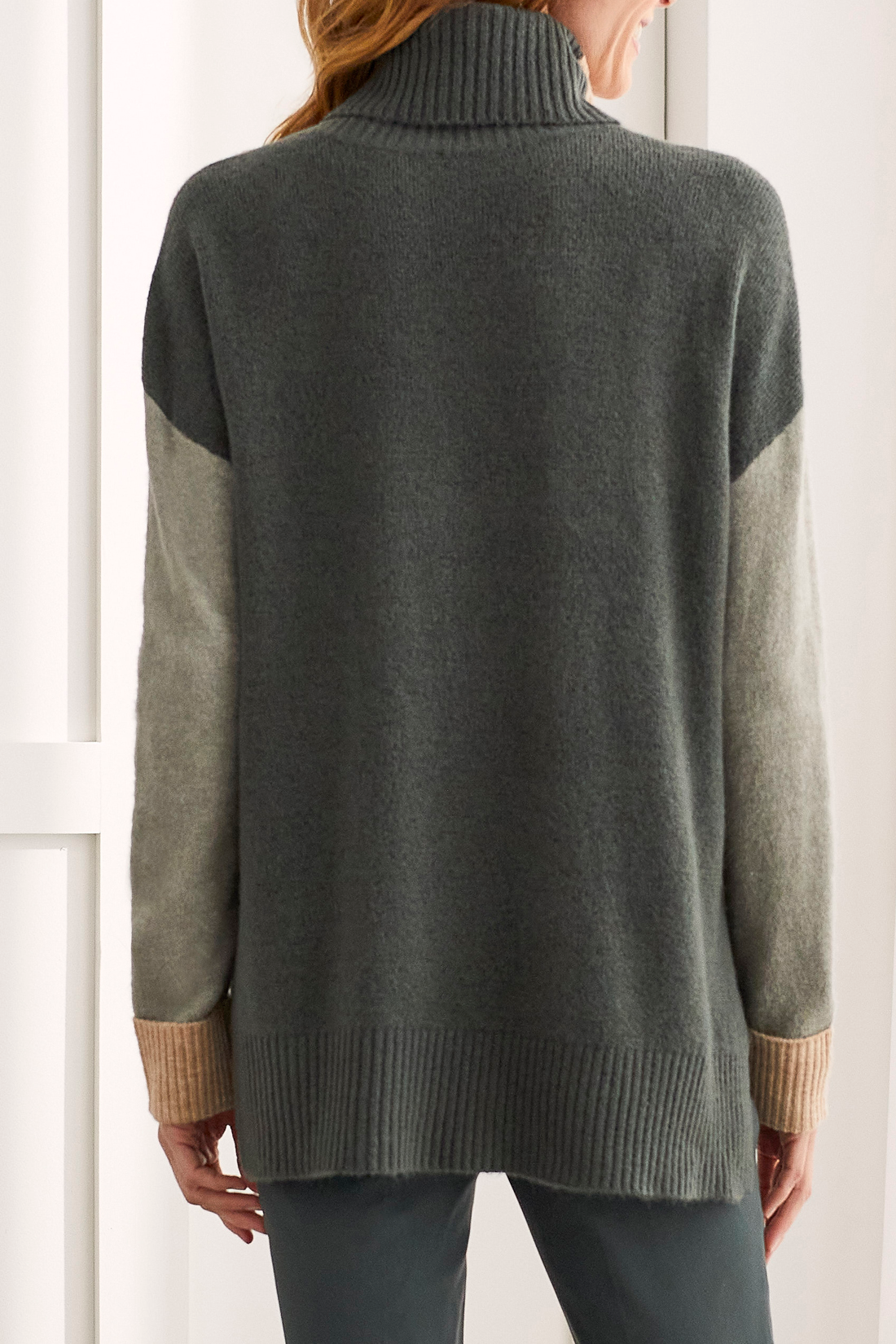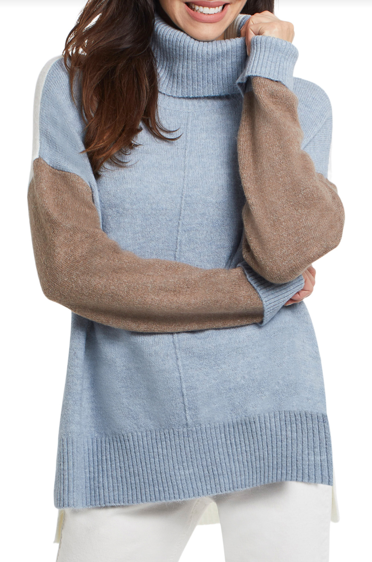 This turtleneck sweater is super cozy and the color block design is a great twist on a basic. The dusty blue matches great with black, gray, or blue bottoms and the white and taupe panels keep it neutral.