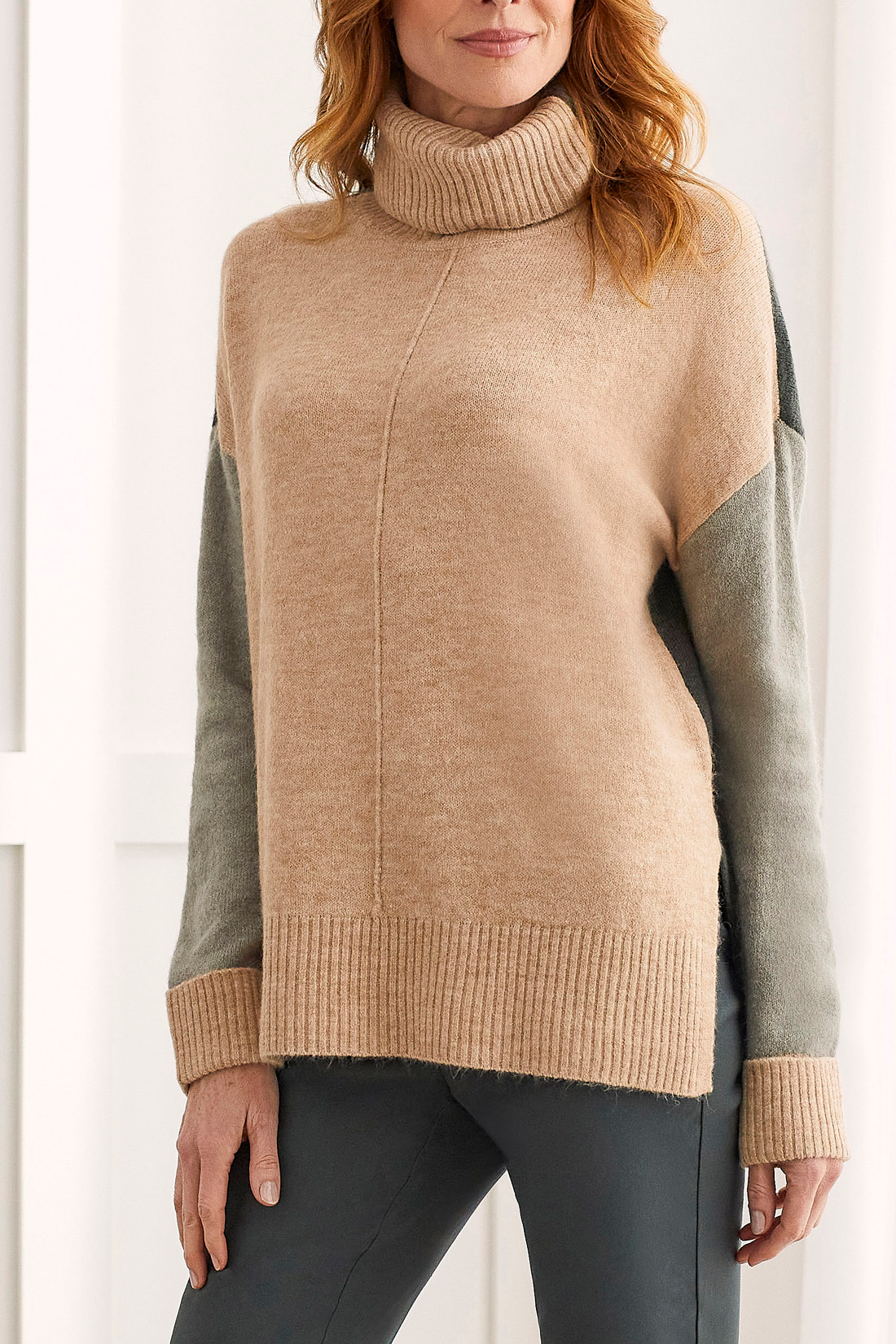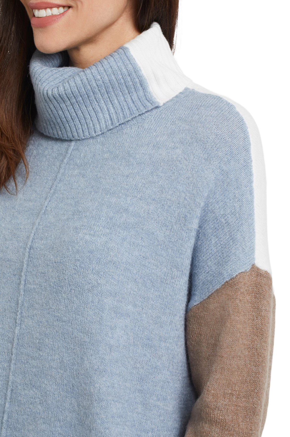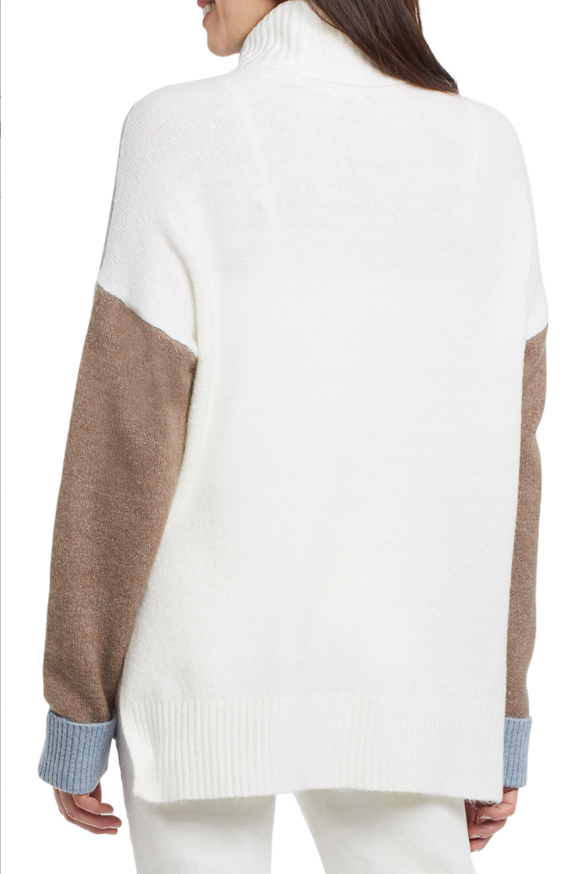 This turtleneck sweater is super cozy and the color block design is a great twist on a basic. The dusty blue matches great with black, gray, or blue bottoms and the white and taupe panels keep it neutral.