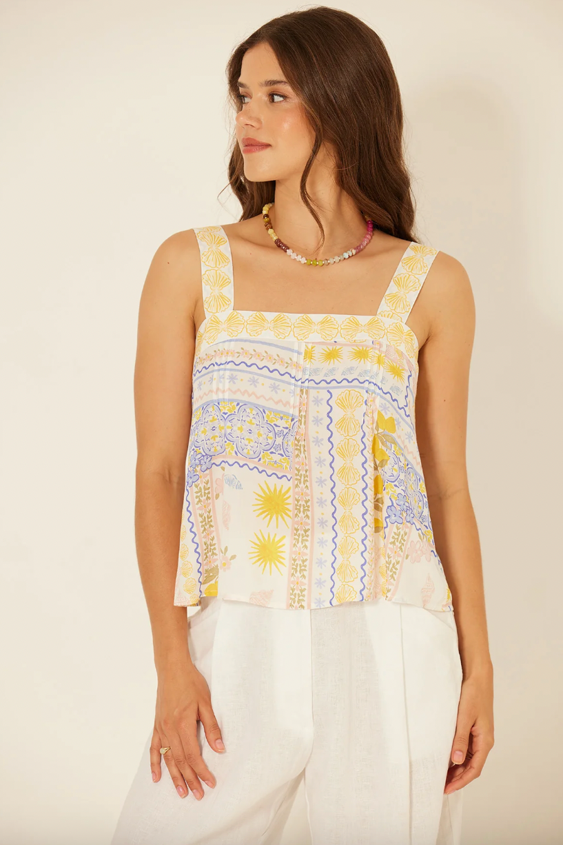 The Lucia Top is a stylish and versatile addition to your wardrobe. Its wide straps provide comfortable support, while the border print adds a touch of elegance. The tie back details allow for a customizable fit. Perfect for any occasion, this top will make you feel confident and effortlessly chic.