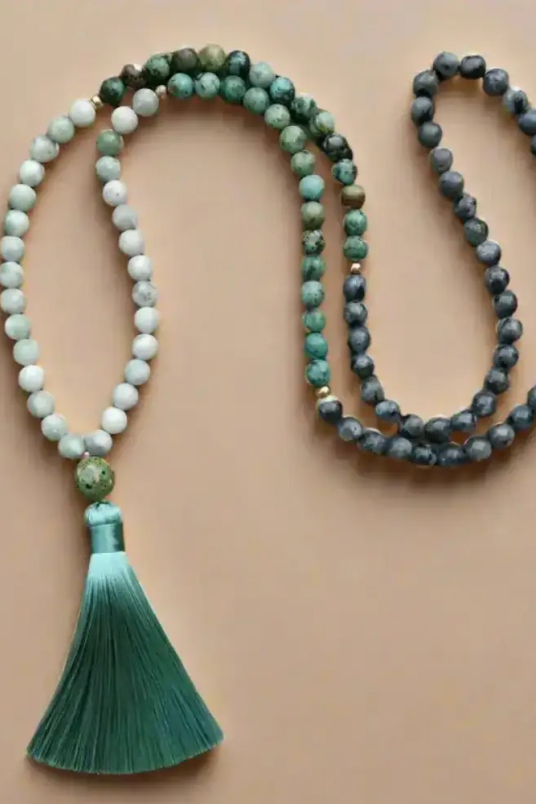 Handcrafted with 108 beads of natural Lucky Jasper, African Turquoise, and Larvikite, this mala necklace promotes harmony and balance. Featuring a vibrant green tassel, it symbolizes growth and renewal. Lucky Jasper brings luck and protection, African Turquoise supports transformation, and Larvikite promotes grounding. This hand-knotted necklace measures around 91cm and is perfect for meditation or daily wear.
