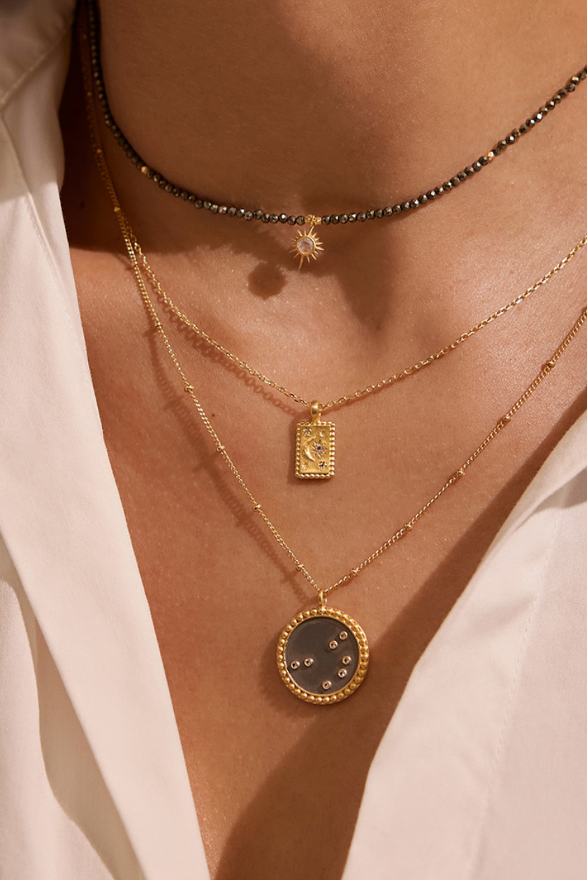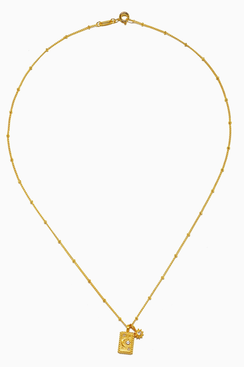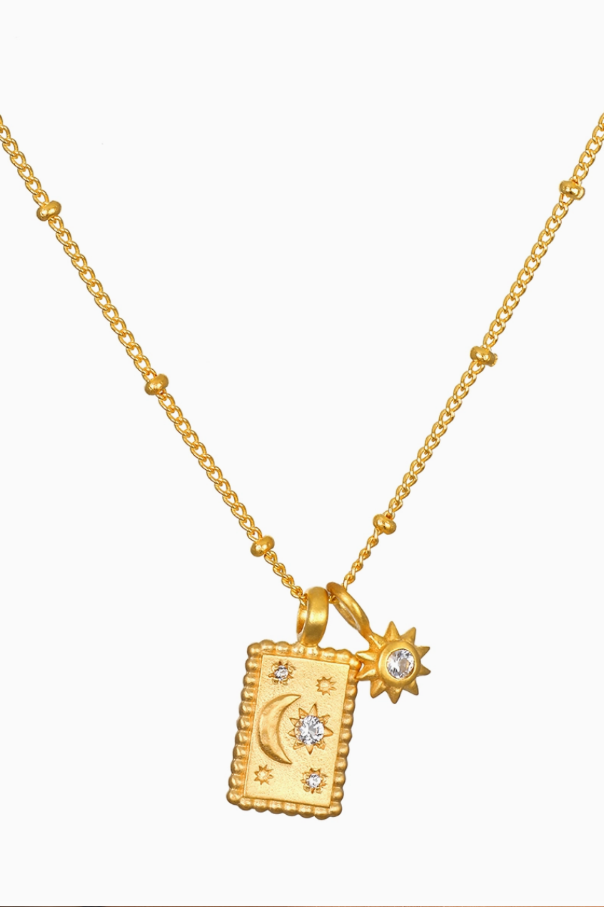 Wherever there is moonlight, there is magic; let it fill you with hope, dreams, and possibility. A celestial charm necklace in 18kt gold plate flutters with a crescent moon and brilliant white topaz stars, symbolizing the goddess and creativity. Wear this celestial necklace to tap into the eternal magic of the night sky.