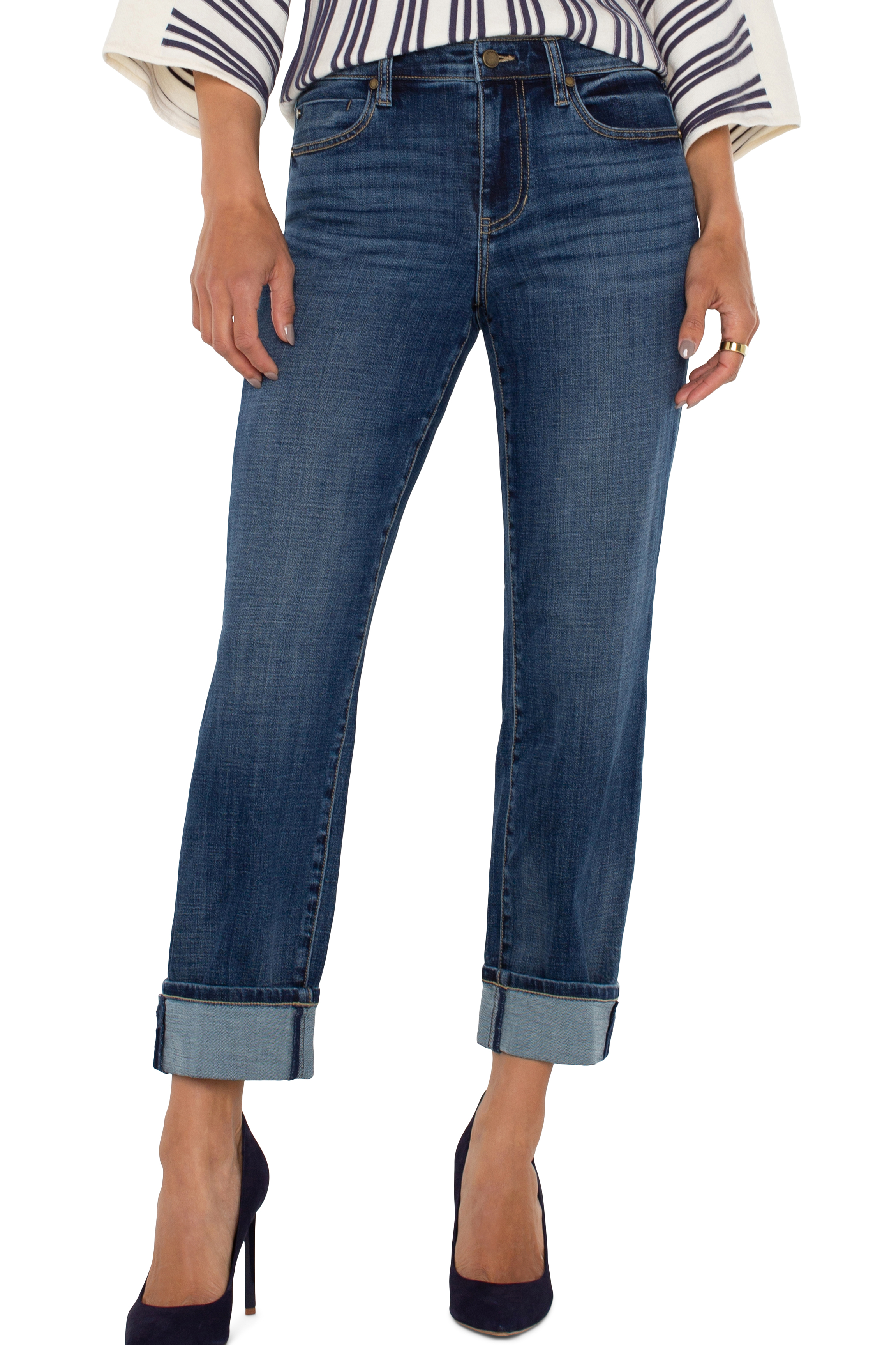 Wide cuffed, capri fitted comfy jeans. These timeless jeans can be worn day or night and with all of your favorites.