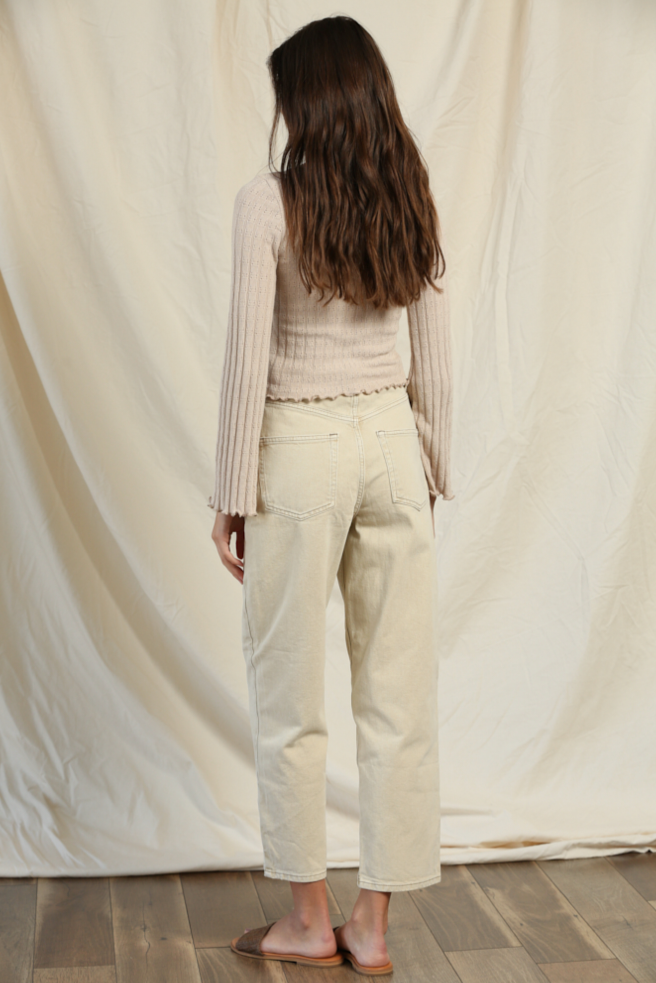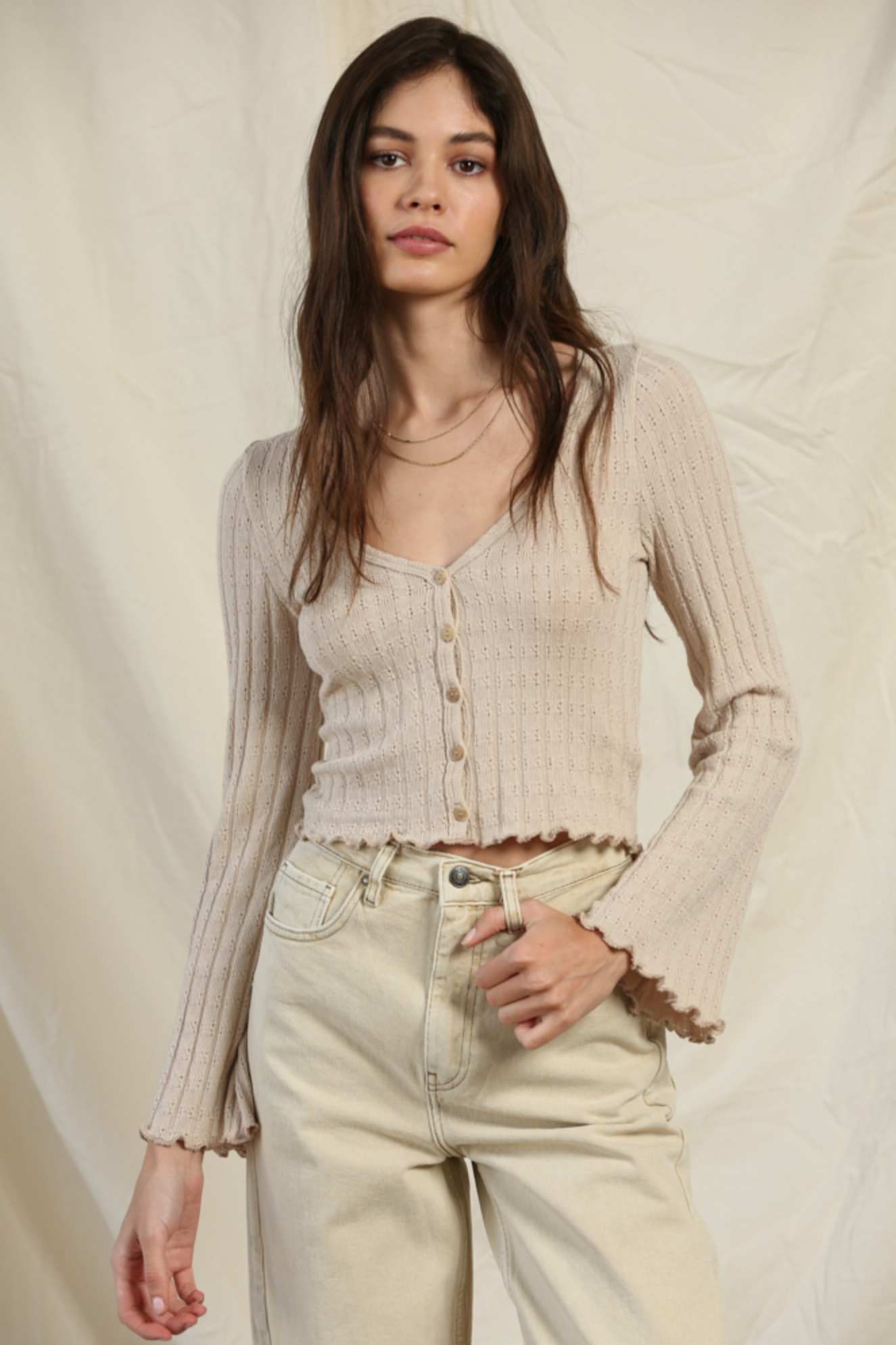 This knit button down v-neck top can be worn open or closed. It has long sleeves and a cropped length.