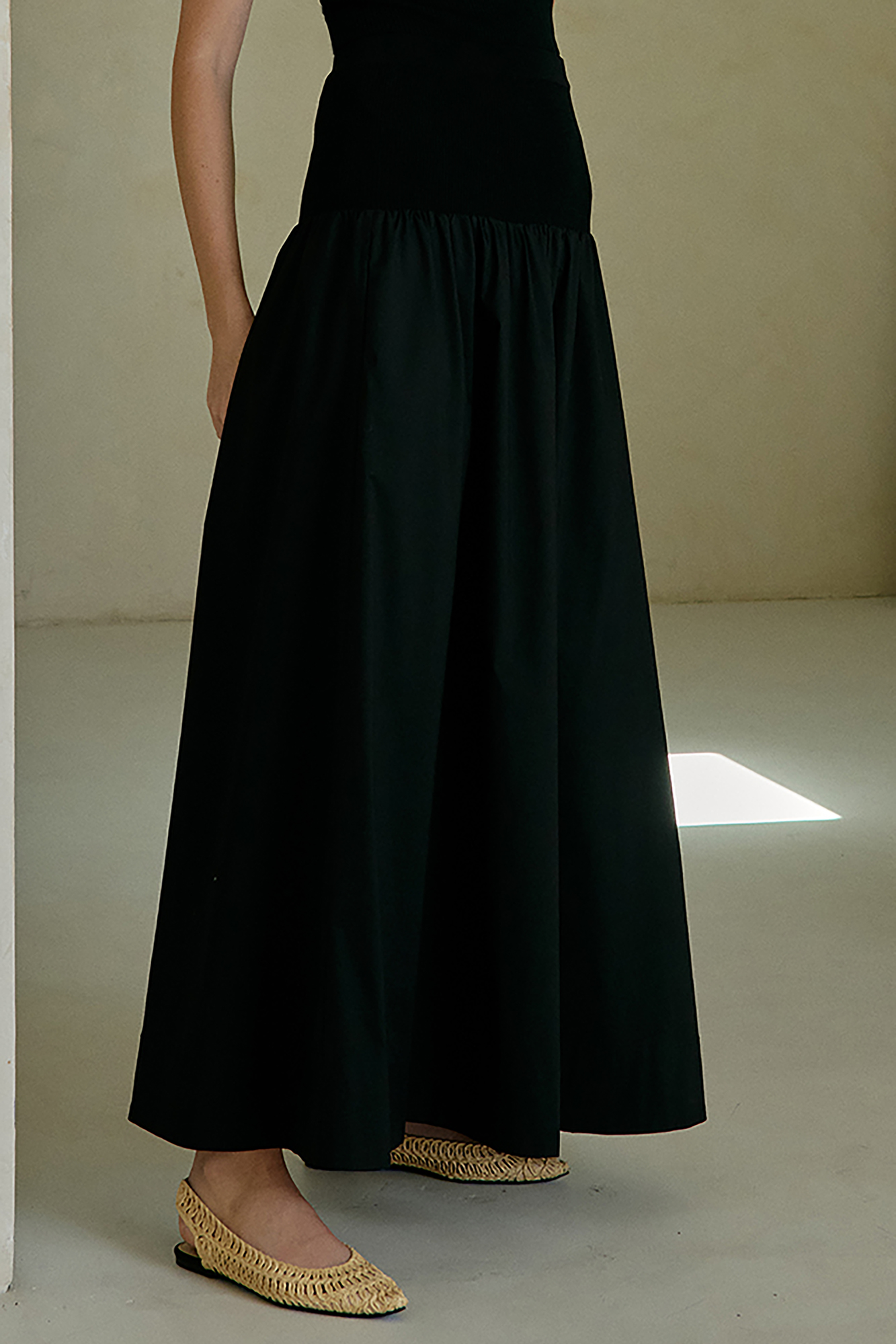 This maxi skirt gives a contemporary twist to any outfit. The smocked top shows the figure and allows the skirt to be worn at any length.