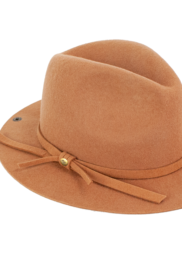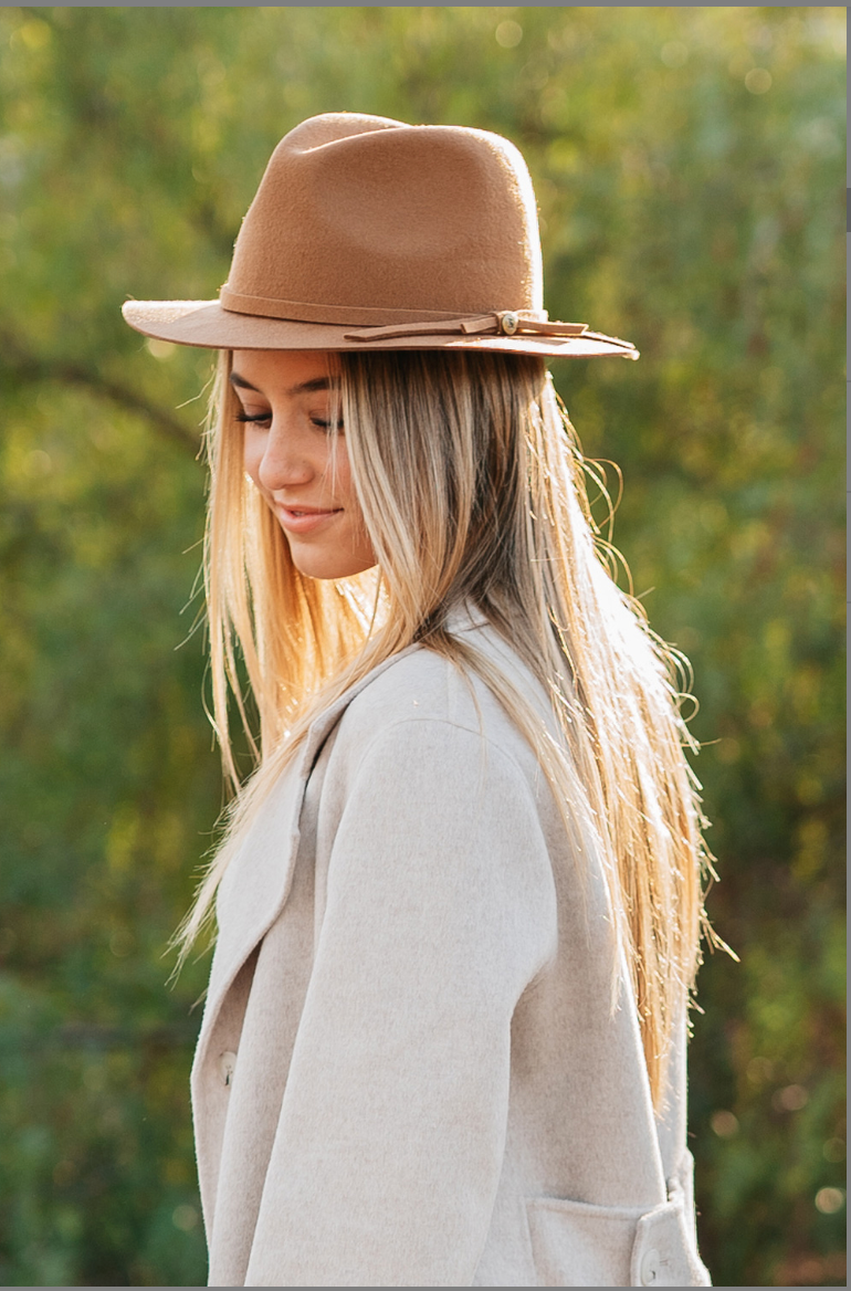 Tan, wool felt hat with matching felt band and gold accent detail. This is a closet staple.