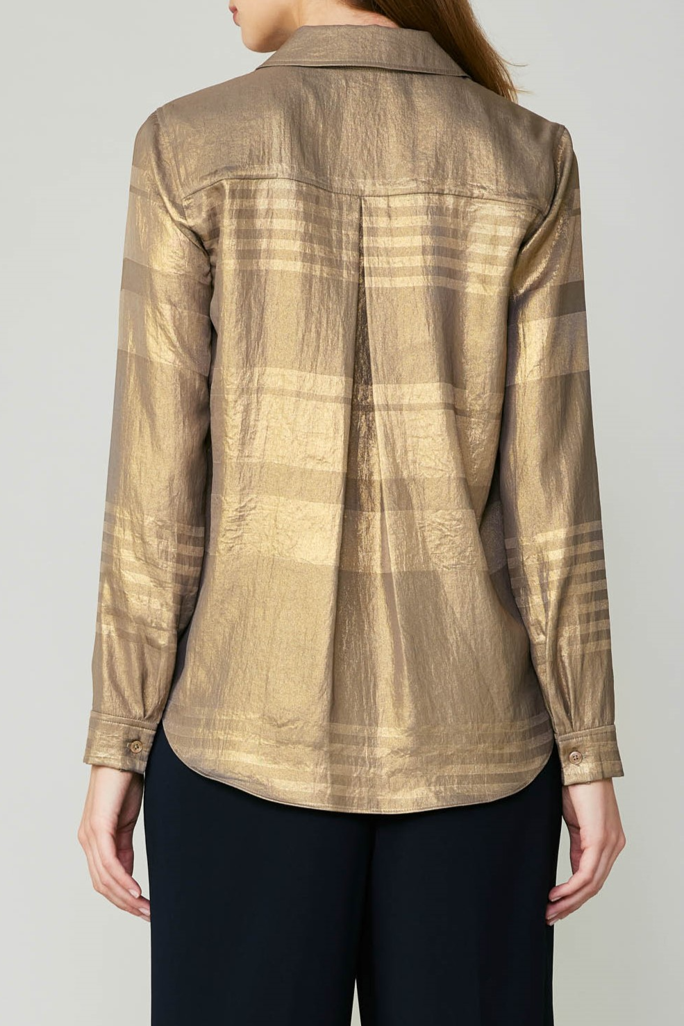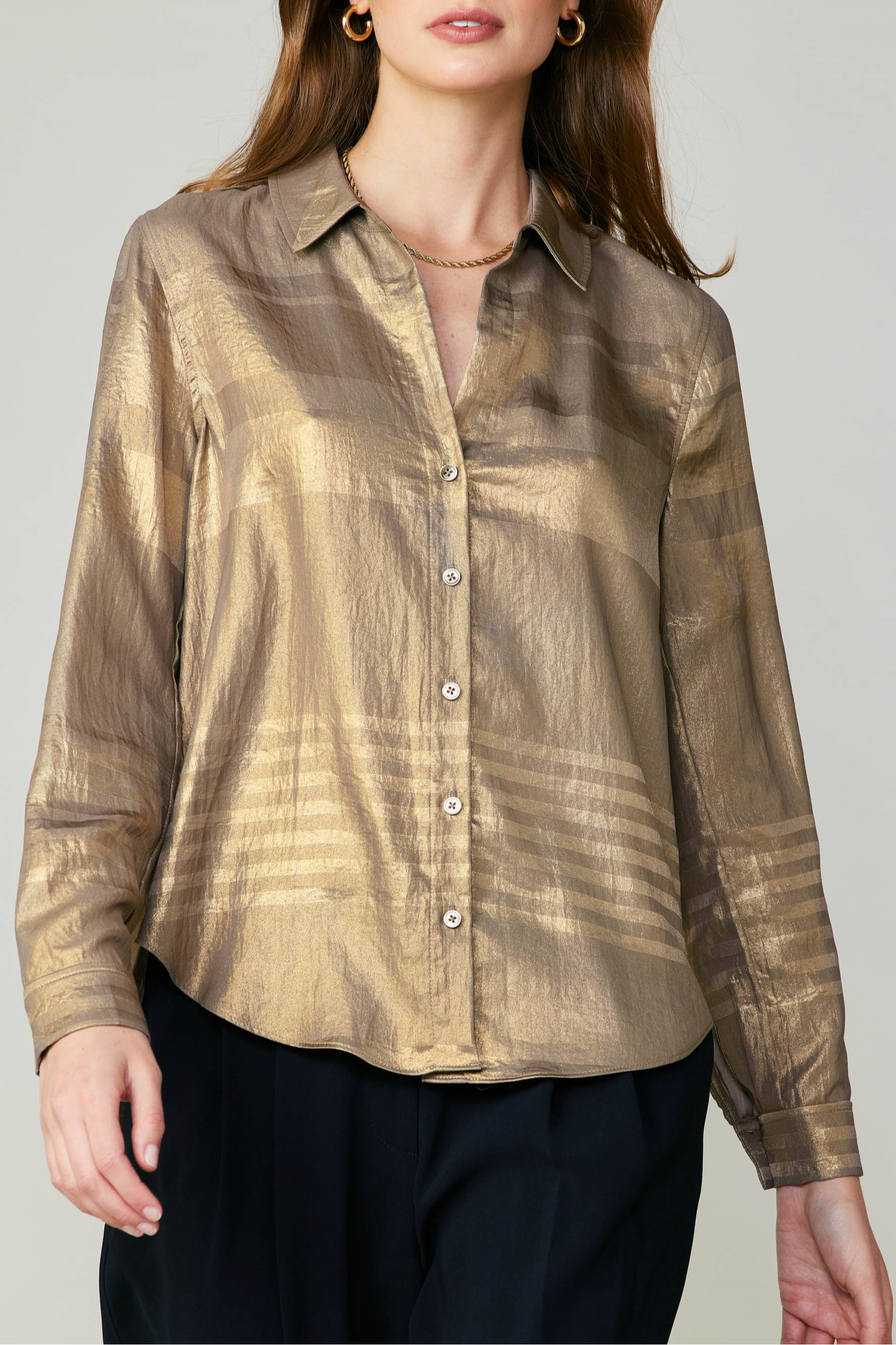 A stand out top to wear to get everyone's attention! The classic silhouette of this shirt makes it easy to wear. With the added shimmer this shirt can be worn for a more party-like event.