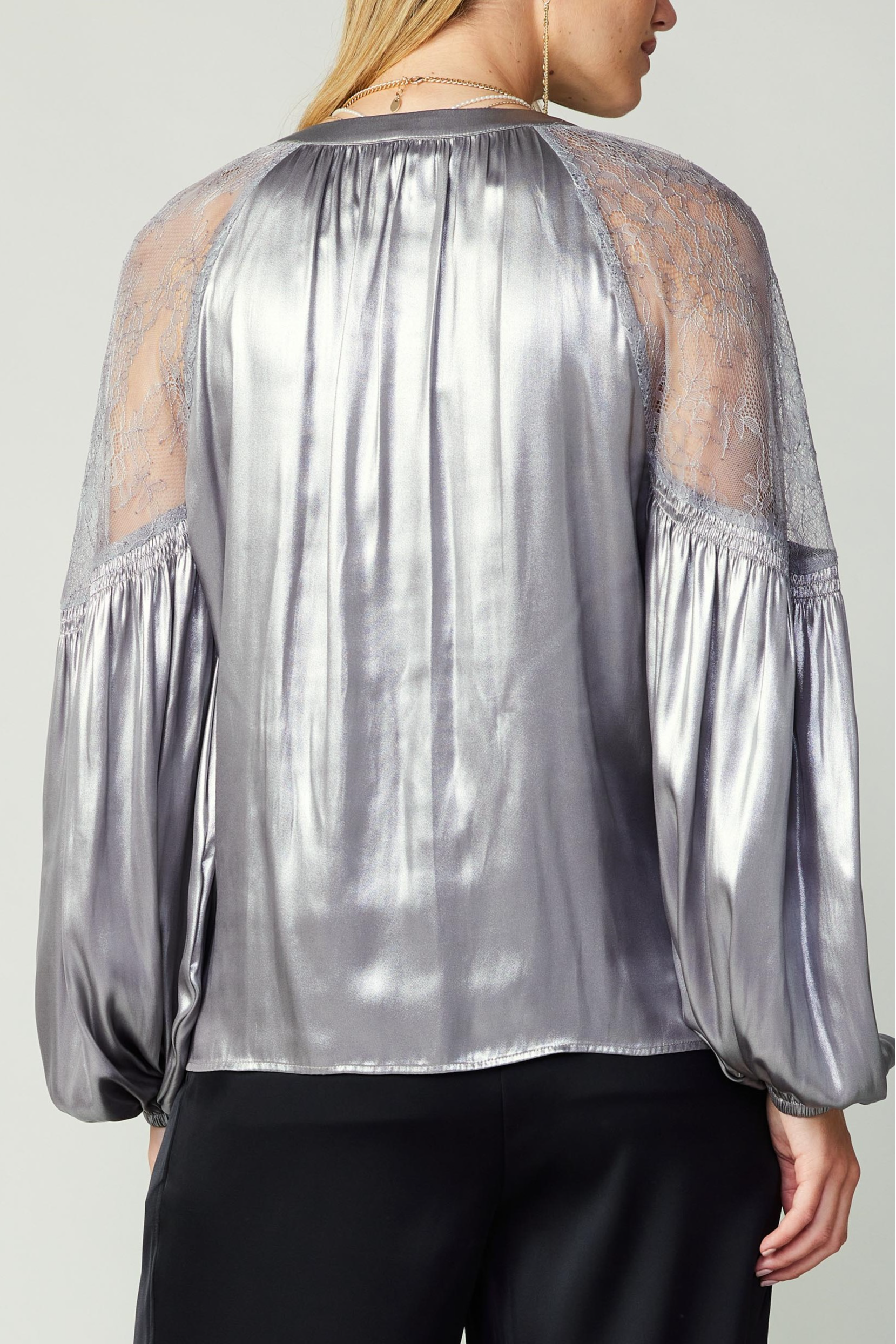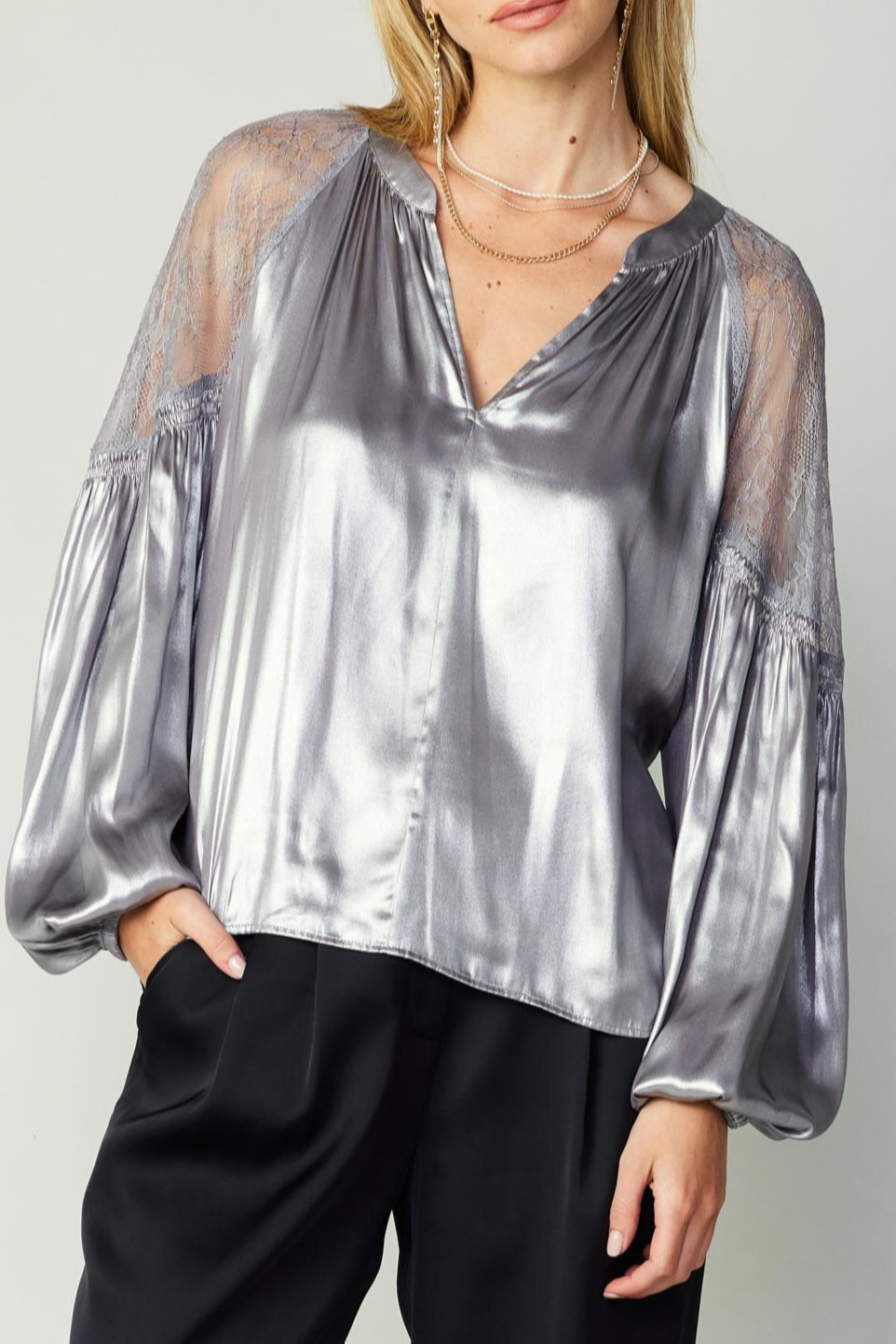 Make a statement in this metallic blouse! This blouse has added detailing of lace on the shoulders, with a relaxed fit that has flowy silhouette.